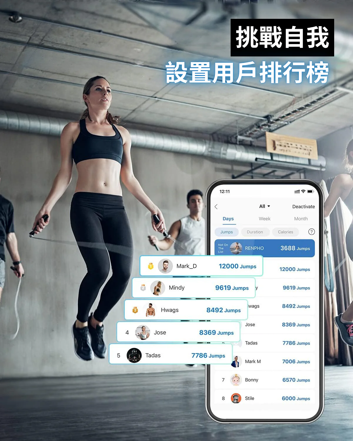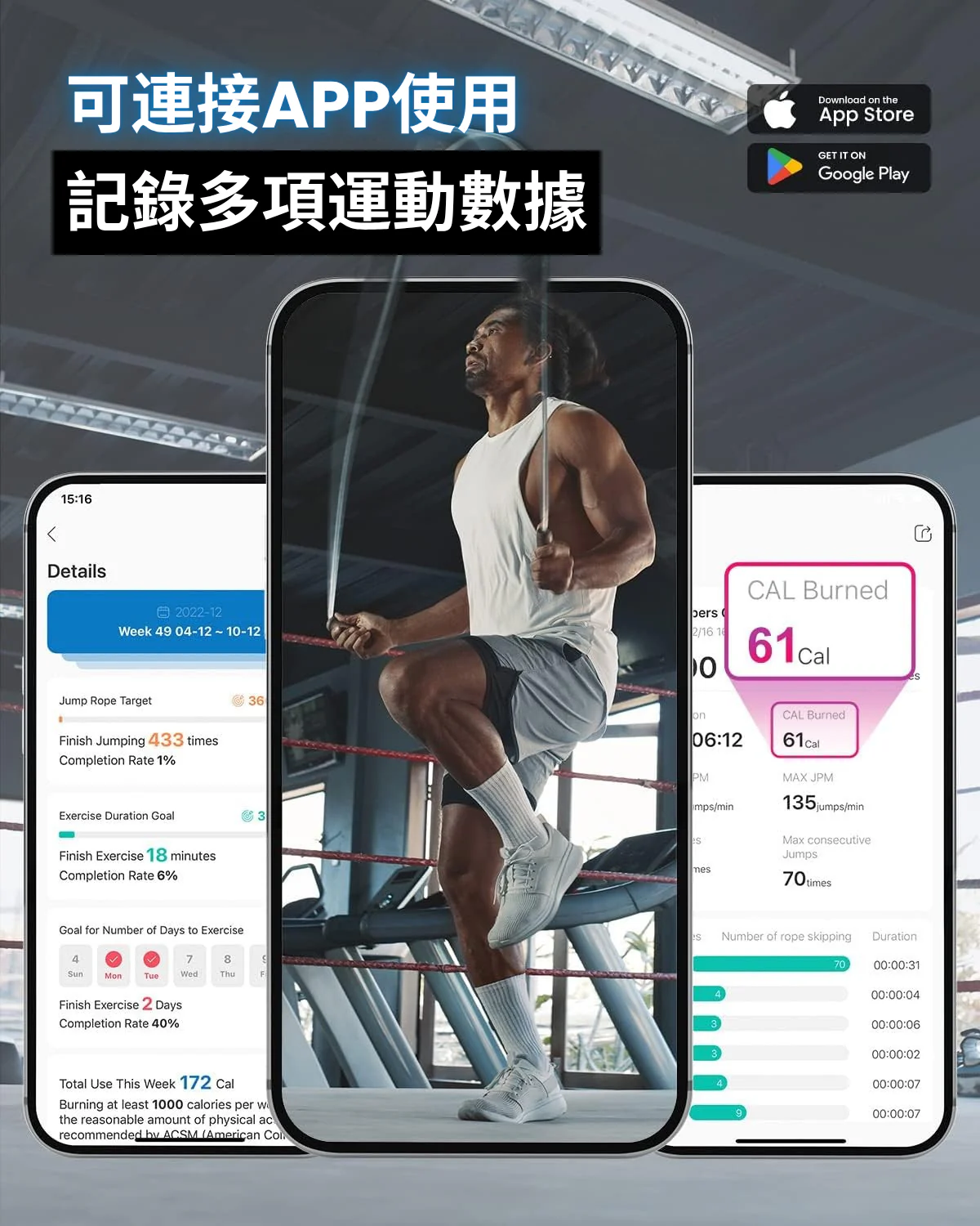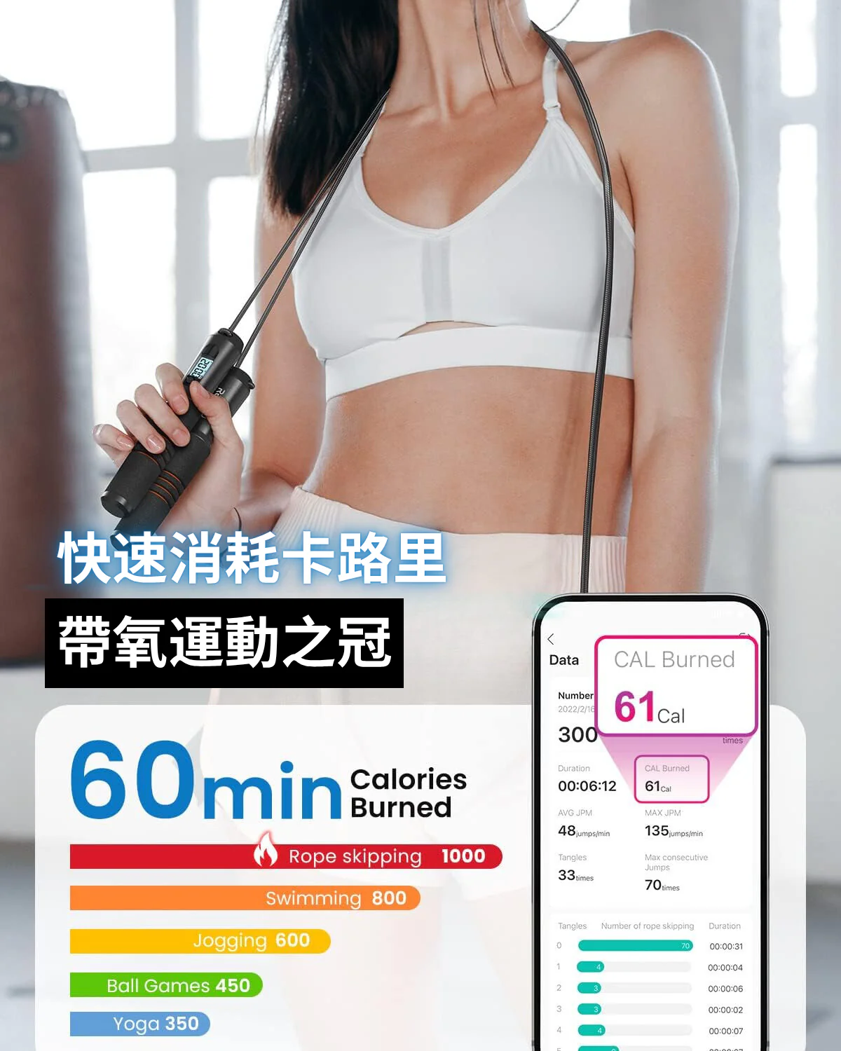 本產品可以與RENPHO Heath APP連接,可輕鬆分析和追蹤您的訓練數據。可隨時掌握您的跳躍時長、總跳躍次數、消耗的卡路里和絆繩次數,以達到您的健身目標。