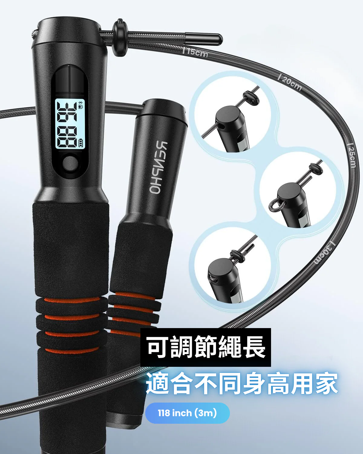 輕量泡棉材質握把,由環保 ABS 和 EVA 材料製成,在運動時提供舒適的觸感及防滑以提高手持穩定度,主握把嵌入清晰 LCD 顯示螢幕,一手掌握為跳繩即時數據,如跳繩時長或總跳繩次數。