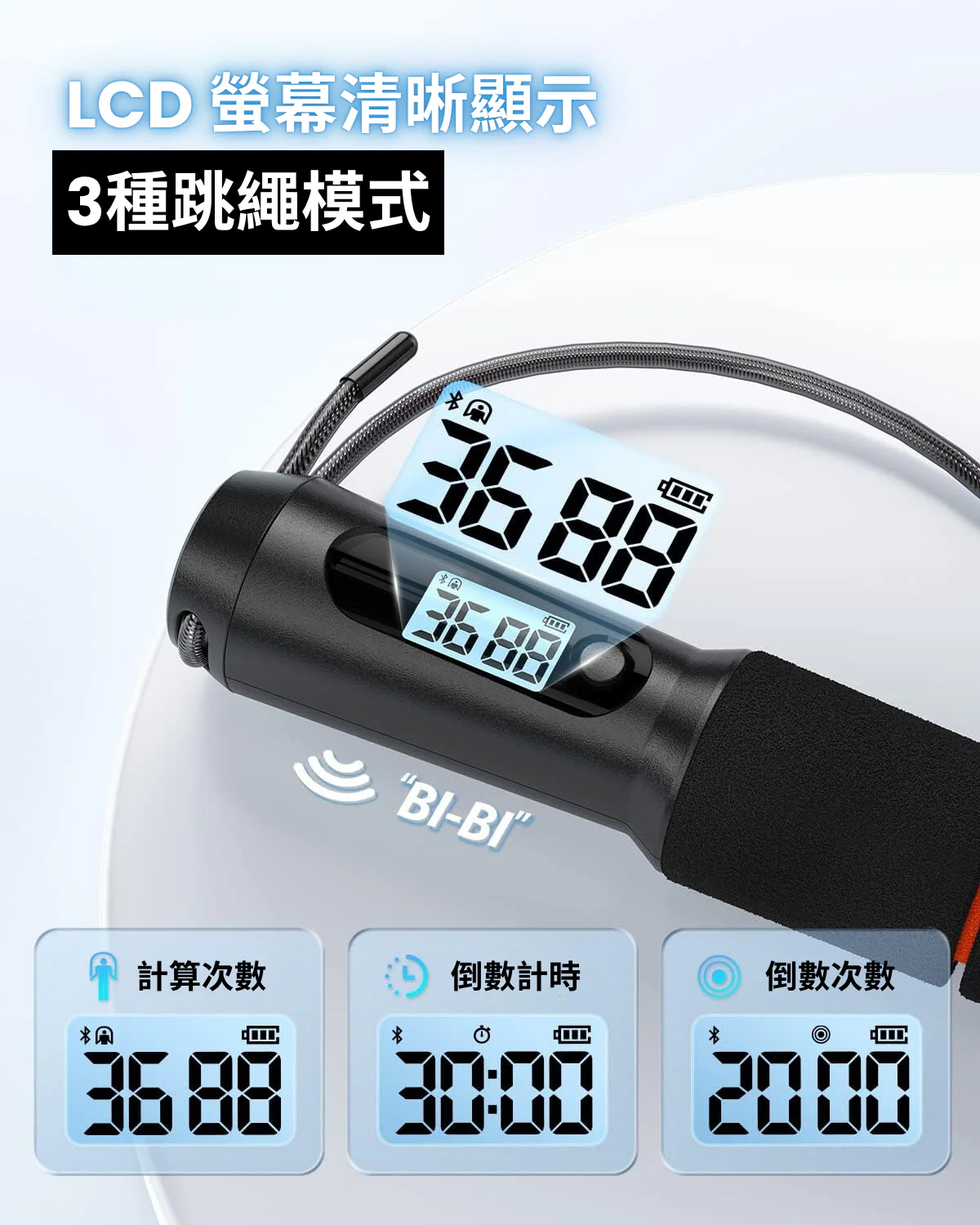 3 種智能跳繩運動模式可供選擇:自由跳 / 時間倒計時 / 數字倒計時。供您安排運動組合計畫!