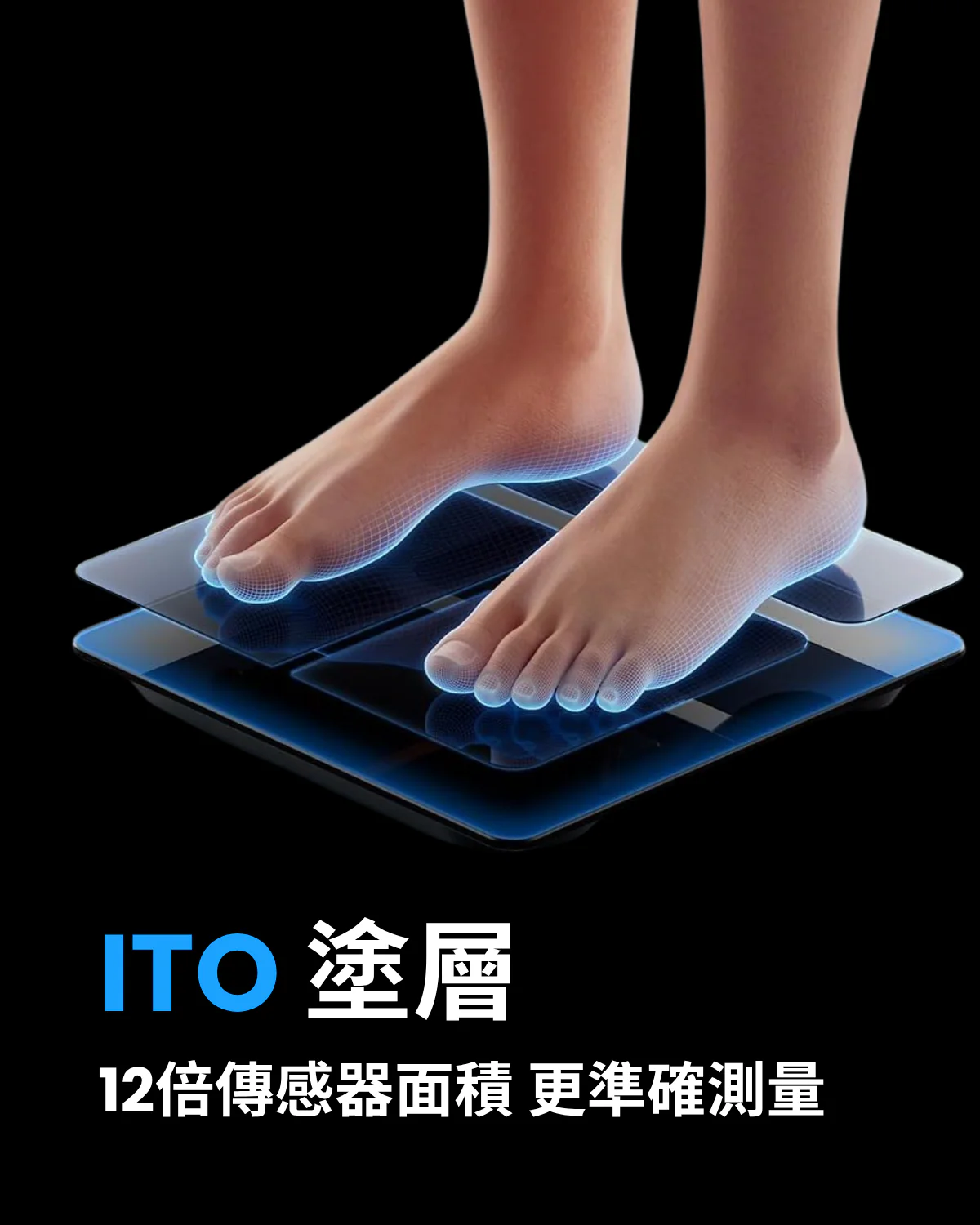 3. 赤腳站立在傳感器上以獲取準確的數據。(如穿著襪子時進行測量,可能無法獲得準確結果。)