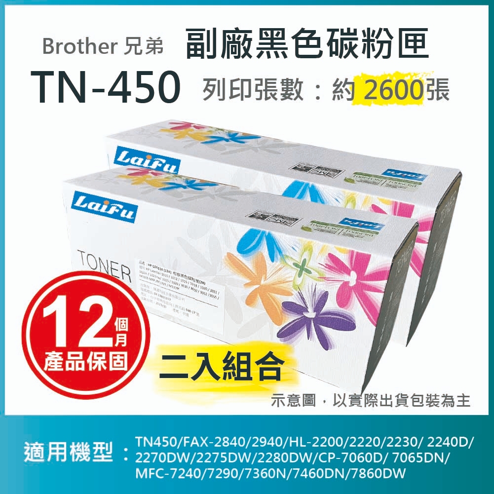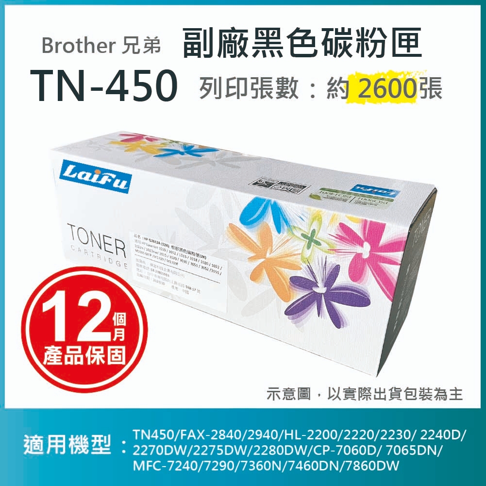 | 產品料號:TN-450 | 適用機型:TN450/FAX-2840/2940/HL-2200/2220/2230/2240D/2270DW/2275DW/ 2280DW/CP-7060D/7065DN/MFC-7240/7290/7360N/7460DN/7860DW |