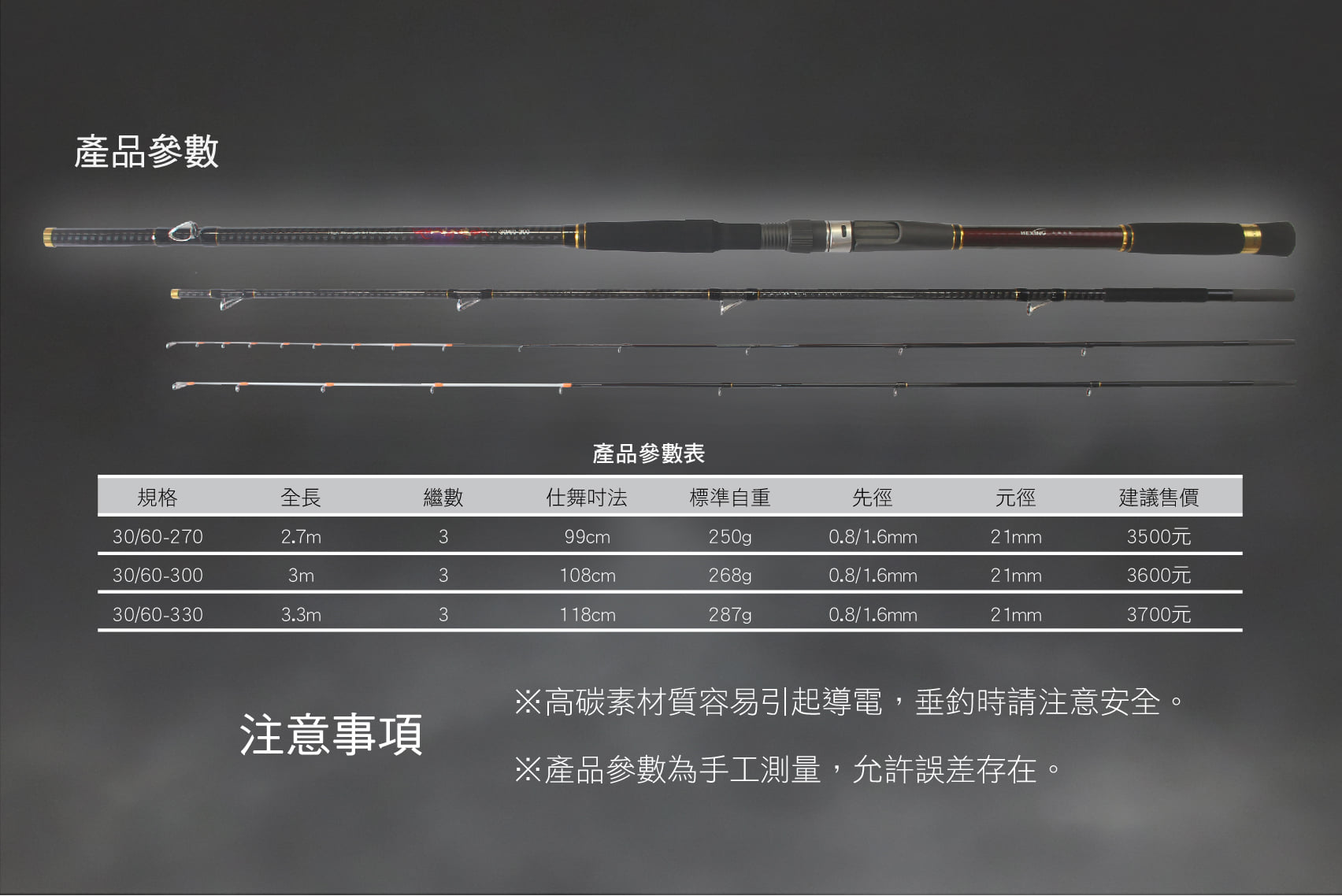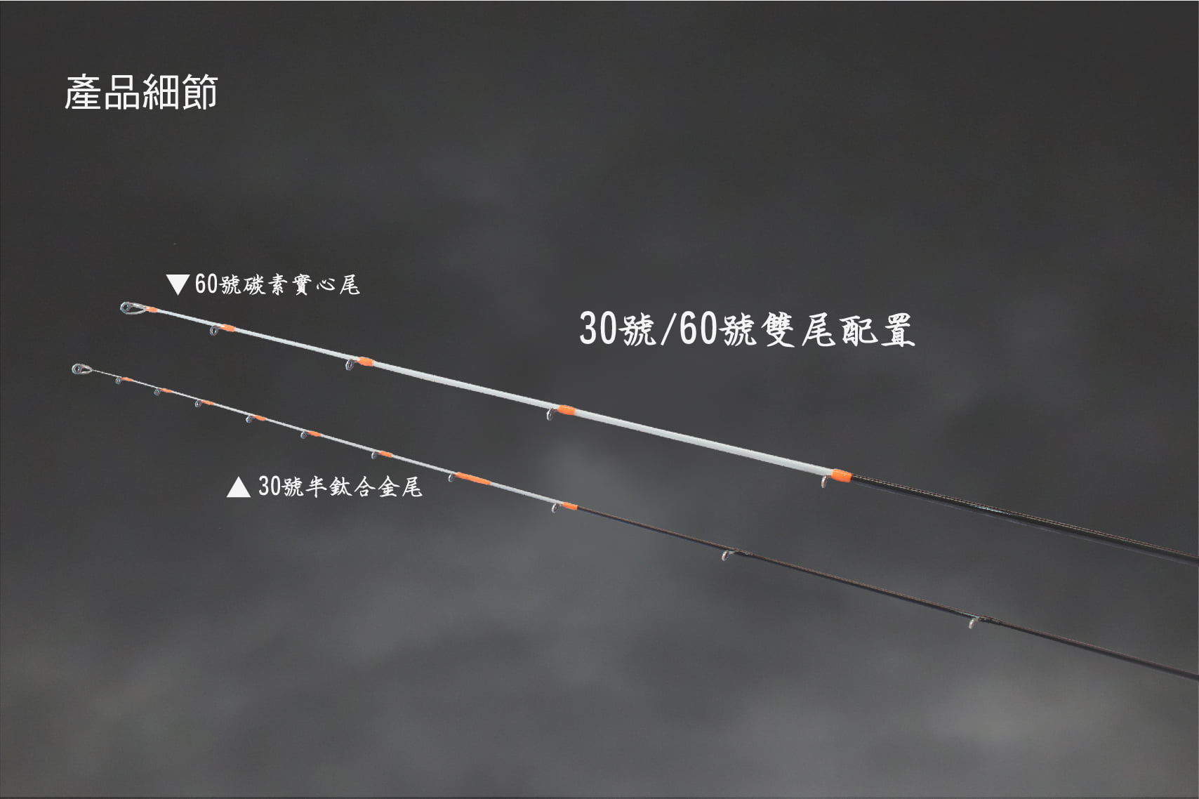 一竿入魂-並繼竿,整體塗裝內斂、沉穩細膩, 輕量化竿身,仍保有其高韌性, 竿體中肚強而有力,30號、60號尾雙尾配置 .30號-半鈦竿尾: 具高敏感度,輕易掌握魚訊不含糊。 .60號-碳素實心竿尾: 揚竿時較具爆發力,起魚速度再提升。 配件不馬虎,使用高品質FUJI-CCLOG+CCLCOG導環 及FUJI-NPS輪座,搭配優異的調性手感,可謂無懈可擊, 一竿即入魂,體驗極致釣趣。 適應釣域:防波堤、水庫、溪流、海釣場、港口等多種釣場 ●30號/60號雙尾配置 ●FUJI-CCLOG+CCLCOG導環搭載 ● 使用FUJI-NPS輪座 ●分體式EVA人體工學握把