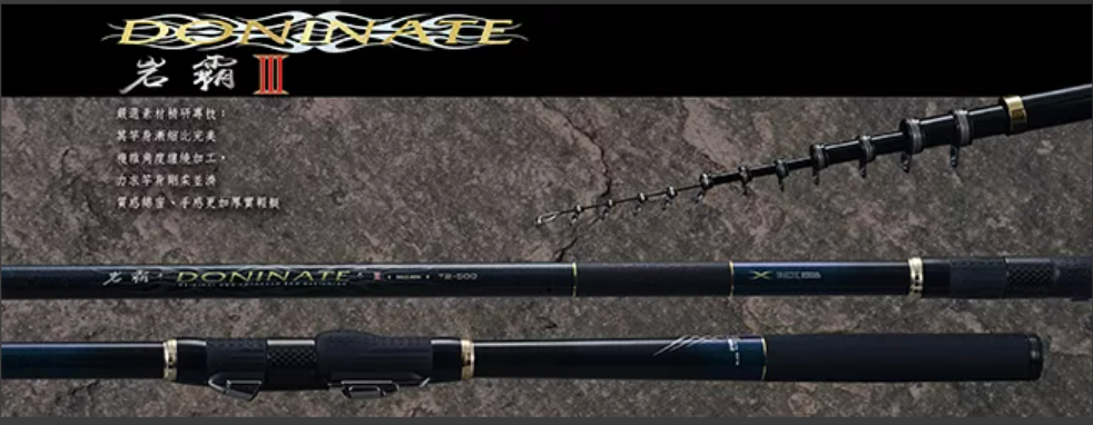 岩霸 (Doninate) 十年前岩霸DONINATE列的上市,引領磯竿市場新浪潮,不僅反映出在設計、製造上的用心,更深切的呼應了磯釣客對磯竿的訴求,全新岩霸Ⅲ代不僅嚴選素材精研專技;新模具更令其竿身漸縮比完美,複雜角度纏繞加工補其韌,力求竿身剛柔並濟、質感綿密、手感更加厚實輕艇。DONINATE岩霸Ⅲ代由上興獨特工法的龍鳳尾接合更是畫龍點晴,由小動作細膩的弄餌,到大動作豪邁的拼搏,無論握、送、作、弄、搏的每一環節,均能發揮的凌厲盡致、 一氣呵成,暢意難以言喻!尾一採用新款富士導環(T-IMSG)使其手感更上一層樓,新造型機能握把不僅美輪美奐, 更是強調其手握功能服貼性,在磯際搏魚之時,使其極佳的握感完全掌握目標魚種的力道,而作出準確應對搏魚戰略。