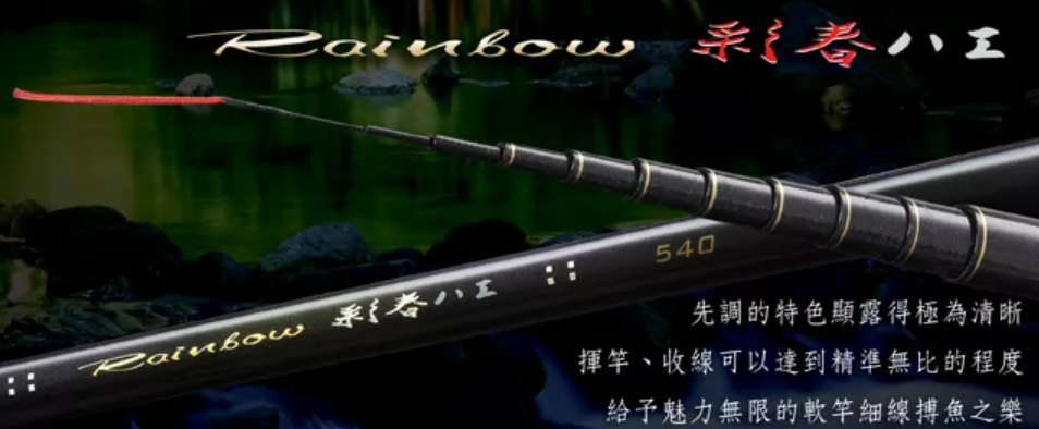 彩春八工 (RAINBOW) 國產八工竿即使總重不高,依然存在尾端過於沈重的通病,尾重則易晃,造成手感鈍重、控竿困難,同時也易纏竿尾,此皆係素材等級不足所致;上興不惜重資,引進超薄碳纖,捲製此間足可與日本大廠頂級竿匹敵的超輕量、極先調「彩春」、「魁」兩款銘竿,為輕量竿的技術水平刻上新註記!