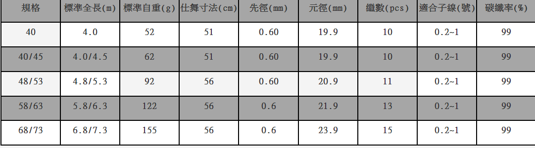新素材加工制作下.使質量達到相乘的效果.輕量敏銳.高強力.高平衡感實現.橡膠止滑握把.輕量細身設計.從竿先至竿身的引張強力.對於所有釣點俎擊.發揮到淋漓盡致.是一把台制溪流竿登頂之作。