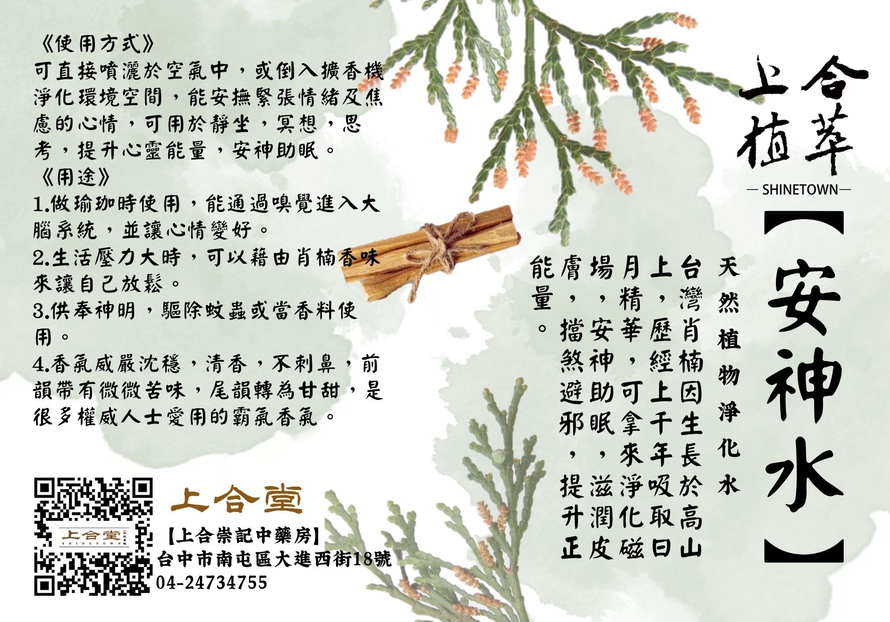 【上合安神水】可直接噴灑於空氣中,或倒入擴香機淨化環境空間。