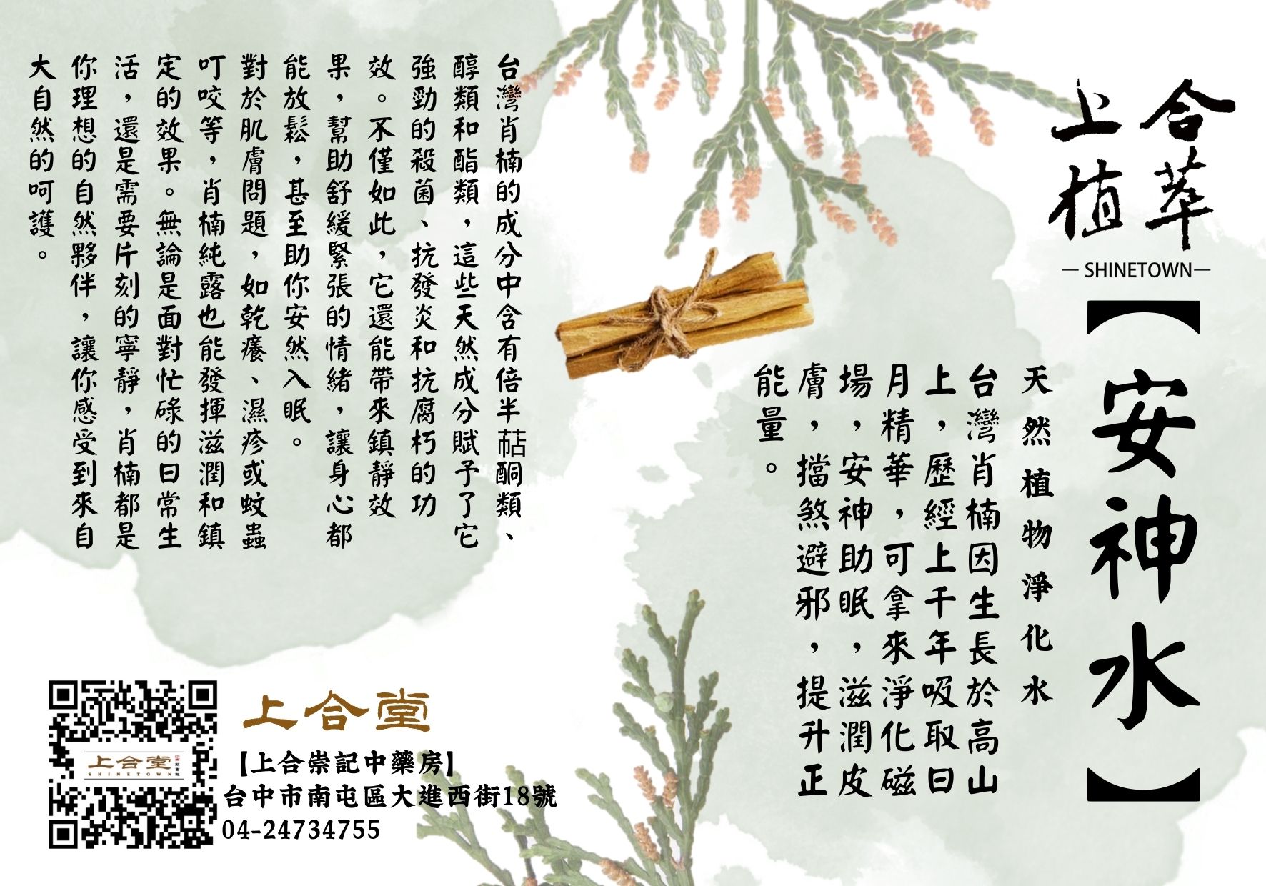 【上合安神水】可直接噴灑於空氣中,或倒入擴香機淨化環境空間。可用於靜坐、冥想、思考、提升心靈能量、安神助眠。