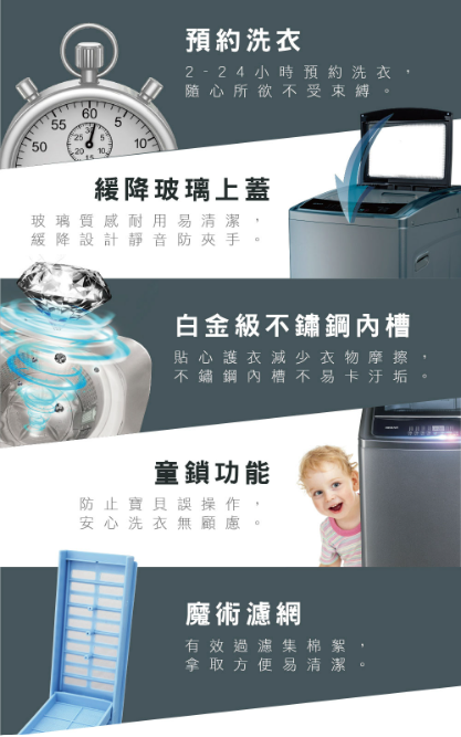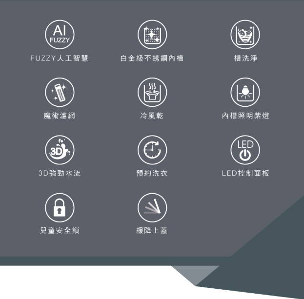 ★服務區域: 桃園以北無需另收運費, 新竹以北地區,需收取跨區費,中南部無安裝及運送服務 ♦本賣場價格含安裝服務。● FUZZY人工智慧 ● 白金級不鏽鋼內槽 ● 脫水防震系統● 脫水風乾功能 ● 透明視窗 ● 3D強勁水流 ● 防鼠塑膠底座 ● 兒童安全鎖 ● LED顯示控制面板 ● 緩降玻璃上蓋 ● 槽洗淨功能 ● 魔術濾網
