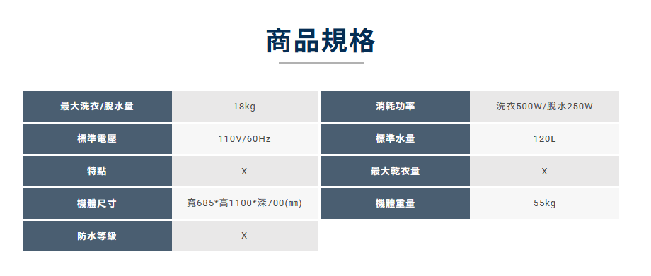消耗功率:洗衣 500W /脫水 250W