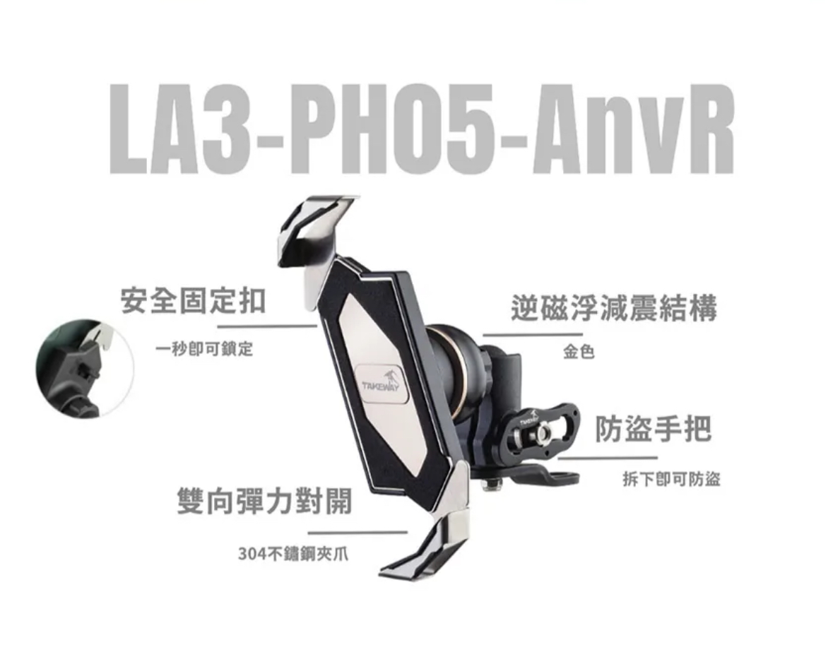 TAKEWAY 黑隼Z手機座組 逆磁浮減震後照鏡防盜版 LA3-PH05-AnvR 機車用手機架 重機必備 ✨商品特色✨ 【磁浮減震版】有效大幅降低車子騎乘時的高頻振動,減少震動對手機的影響 ■ 全球首創 「磁浮減震系統」 ■ 經雙重測試認證 (實驗室&上路測試) ■ 有效降低騎乘震動對手機鏡頭造成的傷害 ■ 兼具安裝穩定度和螢幕可視性 ■ 單手操作, 免安裝工具 ■ 旋轉夾臂設計, 可多角度調整, 兼具防盜功能