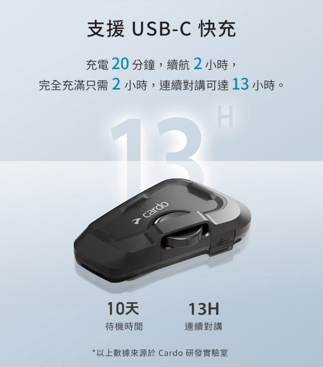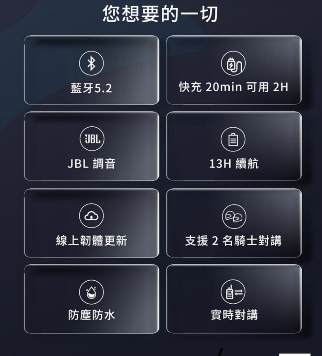 JBL極致音效、全新升級藍牙5.2 • 全球重機騎乘通訊領導品牌 • 40mm JBL音響絕佳音效 • 升級藍牙5.2,快速穩定 • Live Intercom對講連接技術 • 回到範圍內即可自動連接 • 支援 2 位騎士對講 • 最遠 0.8km 機與機對講距離 • 內建三種JLB調音模式可調 • 專屬APP、終身韌體升級 • IP67防水防塵規格 • 音樂對講同步處理 • 自動音量調整 • 可連兩台設備,如手機、GPS • 13小時續航,,10天待機時間 • USB-C快充,充電20分鐘即可使用2小時 • 支援其他品牌藍牙通訊耳機 • FM廣播、音樂共享功能 • 滾輪按鈕設計操作簡單直觀