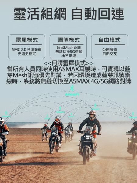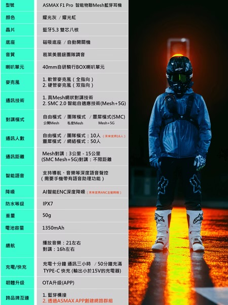 F1 Pro安全帽藍牙耳機 ***本產品為ASMAX海外國際版版本*** 🏆10人"真Mesh"網狀動態連線,小群組車隊溝通暢行無阻(未來增加至16人) 全台市面上擁有"真MESH"網狀連結對講只有ASMAX/SENA/Cardo三家 🏆"真Mesh"連結有"團隊模式"(私人群組)與"自由模式"(開放交友) 🏆團隊模式真Mesh下另有團聊/騎行官聊/私聊三種模式可切換 🏆團隊模式底下可透過橋接或來電帶入它牌耳機至"真Mesh"裡 🏆靈犀模式SMC2.0(當藍芽因環境訊號斷線將無縫切換至4G/5G網路通訊)(2025年下半年推出)(該功能全球第一家推出🏆,已在中國運行超過一年) 🏆對講下混音手機音源(音樂/導航/神盾)且可調音量比例 🏆藍芽Mesh通訊距離空曠處可達1公里以上 🏆ASMAX APP雲聯模式支援它牌耳機下載連結,並創建網路聊天室達50人不同品牌通訊(已於2025年7月推出軟體更新) 🏆"葛萊美"音質調音創建360度環繞聲場 🏆"葛萊美"得獎團隊專為騎行而自研創新設計的BOX喇叭聲學音腔單體 🏆Hi Max語音聲控,徹底解放雙手 🏆AI + ENC智能深度降噪,實測時速180依舊清晰 🏆外觀材質採IML(In Molding Label)漸層頂級工藝成型,在不同角度將呈現不同顏色 🏆磁吸底座(支援自動磁吸開機/離座關機) 🏆自定義燈效及燈色(APP支援) 🏆自動調節音量 🏆音效自定義調整 🏆長效使用時間 : 音樂21小時/對講16小時 🏆超快充效能 : 45分鐘飽電/充電10分鐘可對講3小時 🏆IPX7防水 🏆內建雙芯八核頂規晶片 🏆支援APP OTA一鍵更新 🏆支援2支手機連線 NCC證號 : NCCAH25LP5750T1 ASMAX ASMAX F1 Pro智能物聯安全帽藍牙耳機 顏色 耀光虹耀光灰 NT$4,500 #安全帽 #全罩式安全帽 #復古帽 #飛行帽 #多元支付 #台中市購物節 #銀角無卡分期 #信用卡分期 #月付大人 #童帽 #雨衣 #手套 #車架#無卡分期 #kyt #M2R #THH #Astone #zeus #SOL #NIKKO #EVO #NINJA #行車記錄器 #藍芽 #安全帽藍芽耳機