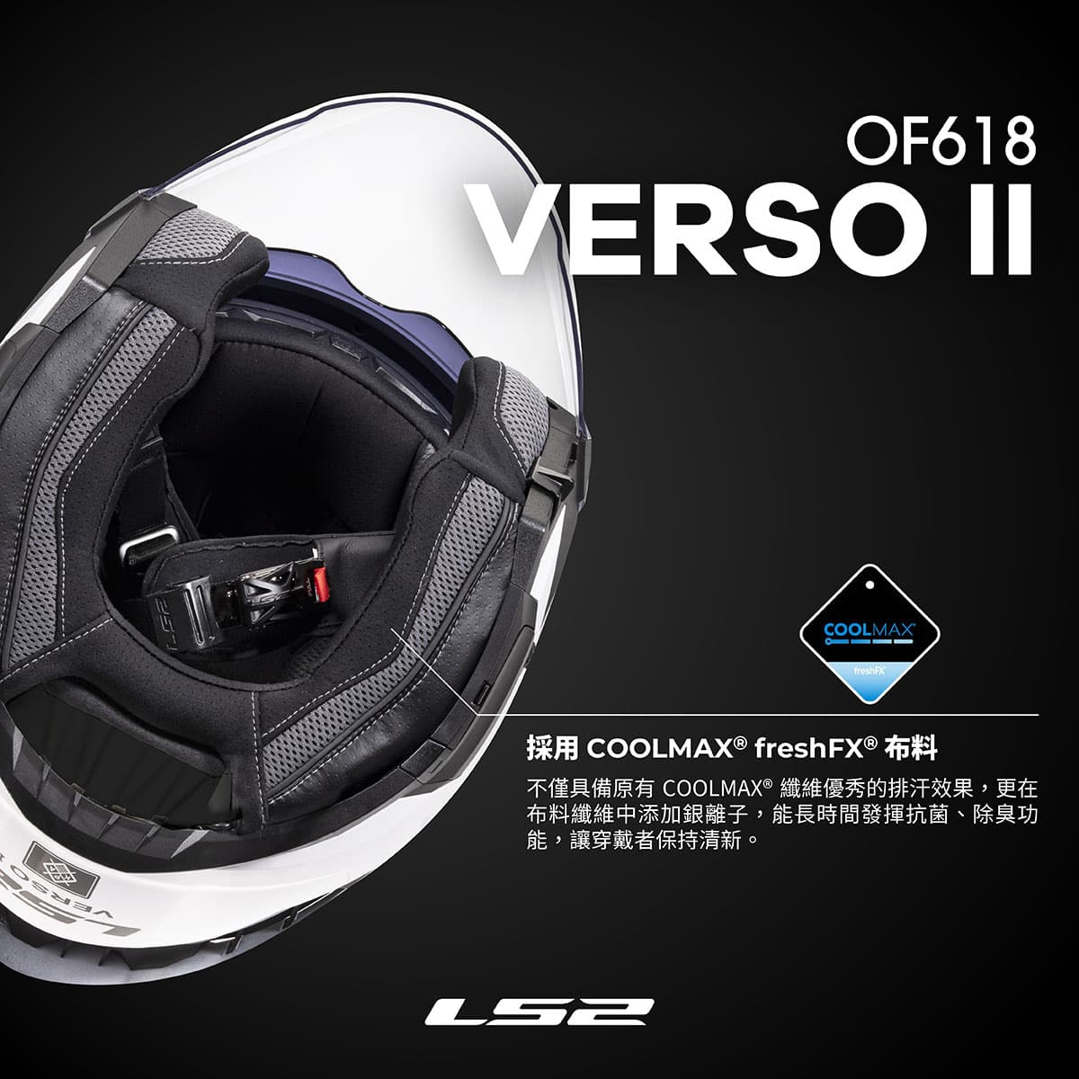 LS2 OF618 VERSO II AIR彩繪 【LS2 OF618 | 內襯採用COOLMAX® freshFX®布料技術】 高規格的OF618,在內襯上也下足功夫!採用COOLMAX® freshFX®奈米級銀纖維布料 不僅具備原有COOLMAX®優秀的排汗效果,布料纖維中添加銀離子, 能長時間發揮抗菌、除臭,讓穿戴者保持清新。 產品特點 通過ECE22.06 & CNS加強型 可加裝PINLOCK防霧片 COOLMAX吸濕排汗布料 ※多密度EPS ※鏡片抗刮抗UV ※夾層循環通風 ※鏡片快拆系統 ※KPA塑材帽體 ※快拆內置墨片 ※金屬排齒插扣 ※藍牙耳機擴充 ※構型雷切泡棉 ※內襯全可拆洗 ※3D立體耳襯附鏡鏡溝 帽款 3/4罩式(Jet-Type) 帽體種類 小帽體 (S) 中帽體 (M、L) 大帽體 (XL~3XL) NTD 3,400(建議售價) #安全帽 #全罩式安全帽 #復古帽 #飛行帽 #多元支付 #台中市購物節 #銀角無卡分期 #信用卡分期 #月付大人 #童帽 #雨衣 #手套 #車架 #無卡分期 #kyt #M2R #THH #Astone #zeus #SOL #NIKKO #EVO #NINJA #行車記錄器 #藍芽 #安全帽藍芽耳機