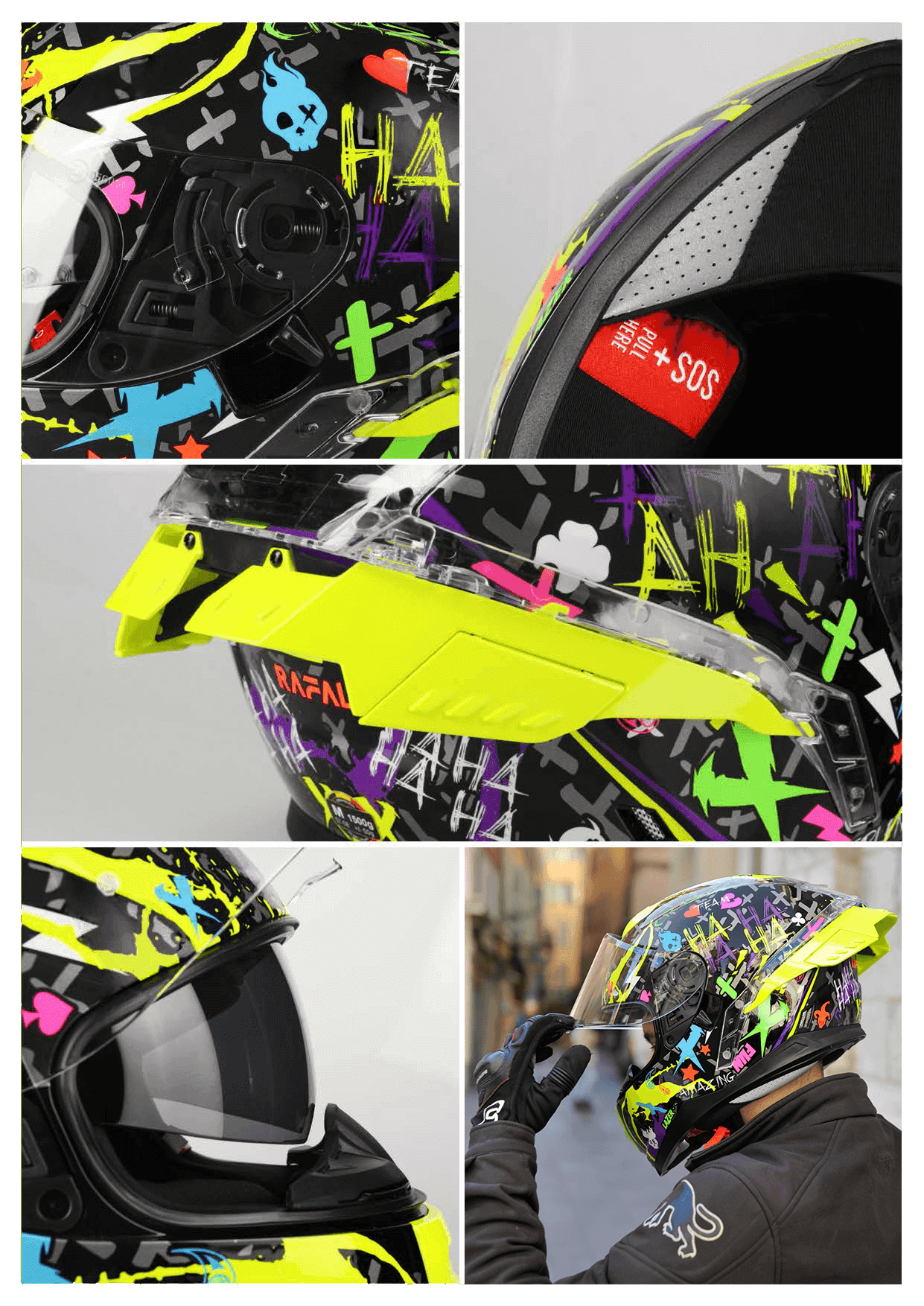 @新素材I.M.A.C - 耐衝擊複合合成材質 @全新可調風門的競技款空力擾流板 @通過ECE 22.05,內建墨片 @鏡片快拆結構,為亞洲頭型單一帽殼 @因應不同部位,EPS採用四種密度 @方便開關的進氣結構 @設計5個通風口,騎乘時更加舒適涼爽 @3D內襯可調整眼鏡溝設計,三件可拆方便清洗 @防止霧氣倒流的鼻罩及透氣下巴網 @SOS+內襯緊急拆除系統 @預留藍芽擴充空間,雙型雙內徑之雙D扣環 帽款 全罩式 (FULL FACE) 重量 1550 ± 50g (未含鏡片)