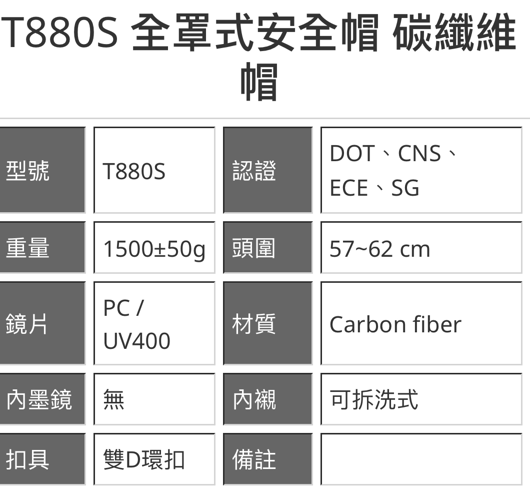 全新帽款即將上市🤩🤩 T880S,擁有DOT、CNS加強、ECE、SG認證,嚴選航空材質,帽殼採用最高等級碳織維,高硬度、耐化學性、能承受高溫且具有低熱膨脹性,卻超輕量😎。搭配擾流鴨尾,即使高速也能給你最小風阻和最佳穩定!6個導風口,後方流暢排熱,保麗龍開孔設計、搭配質感網紋涼感科技布,即使是炎熱的夏天也不用再流滿汗🥵🥵。 高科技多層膜技術,飽和五彩護目鏡卻保持視線清晰,高規格PC材質強化鏡片,耐用更不易破碎,寬闊全景視野,特殊工法鏡片貼緊帽殼,不漏風不漏雨💪💪💪 科技與技術的結合,匠人鍛造碳織維全新帽款,全亮面處理,低調的碳織維紋路,陽光灑落,藏不住的奢華感😍😍😍😍 顏色: 碳纖維 頭圍:57~62 cm 尺寸:S~2XL 安規:DOT、加強CNS、ECE、SG 內襯:全可拆洗式 扣具: 雙D扣 重量:1500±50g 材質:碳纖維