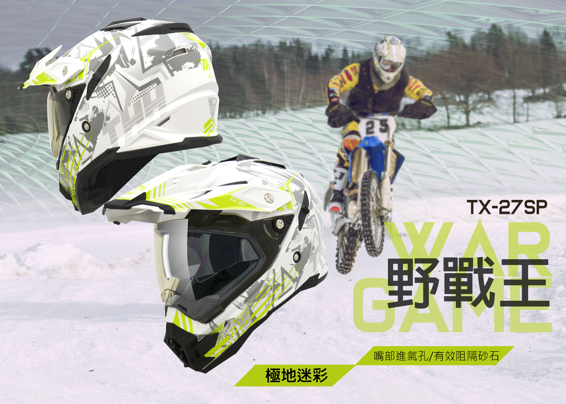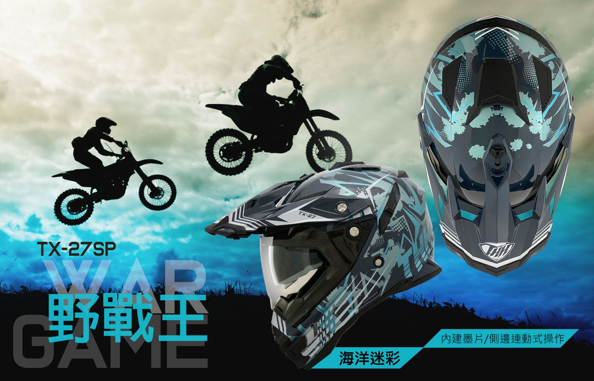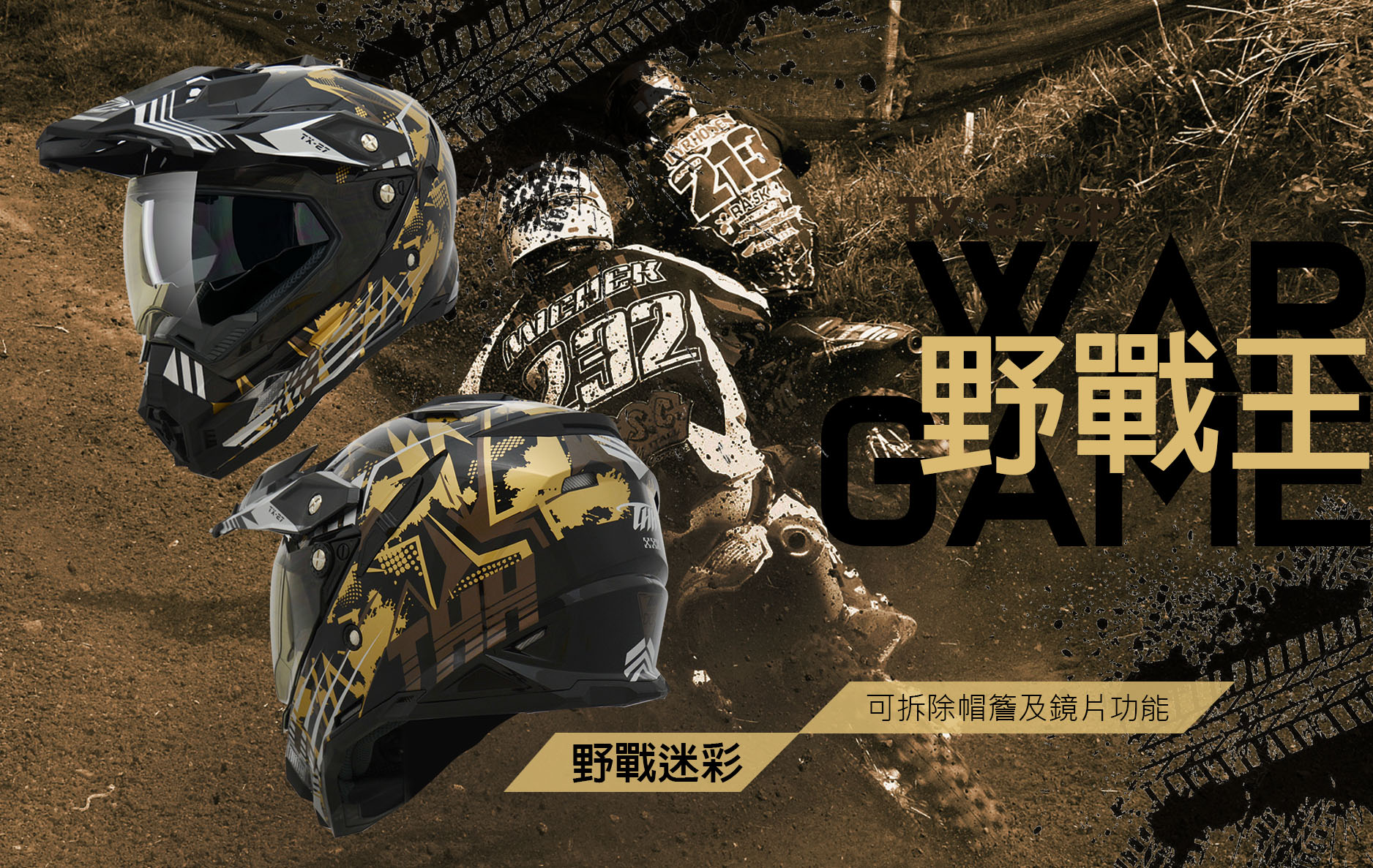 一共有四款迷彩配色/海洋/沙漠/極地/野戰/ 幾何圖迷彩有別於傳統迷彩結構, 圖案造型帶有衝擊及速度感, 針對越野車以及滑胎車族群所設計的帽體, 帽體設計參照亞洲人的頭型,降低配戴的不適感。