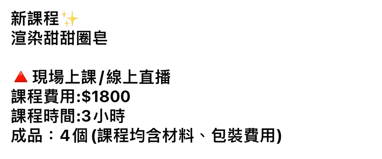 新課程渲染甜甜圈皂現場上課/線上直播課程費用:$1800課程時間:3小時成品:4個(課程均含材料、包裝費用)