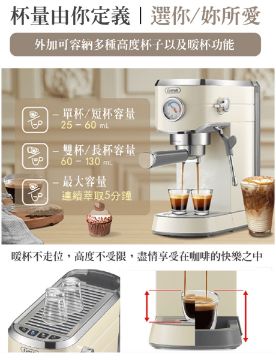 產品特色: PID精準溫控、咖啡機精華的關鍵 雙鍋雙泵加熱系統切換免等待打奶泡。 30段式定量研磨器可以自行任意調整。 預浸泡系統,釋放濃郁風味。 58mm標準咖啡手柄 智能安全設計自動待機。 熱水功能。 20bar 高壓萃取幫浦壓力可以萃取好的油脂Creama Thermoblock 瞬速加熱系統,享受咖啡不必等 穩固強勁蒸氣壓力,輕鬆打出細綿完美奶泡 壓力錶設計,每杯都是專業的好咖啡。 研磨一體機的設計不占空間。 智慧自動除垢,清潔方便簡單。 Gevi研磨半自動義式咖啡機,做到咖啡館的專業設計!20BAR 專業級高壓萃取,壓力錶設計、萃出咖啡油脂精華。更有強勁蒸氣,練習拉花一氣呵成,隨時享受一杯好咖啡!家就是我的咖啡館。