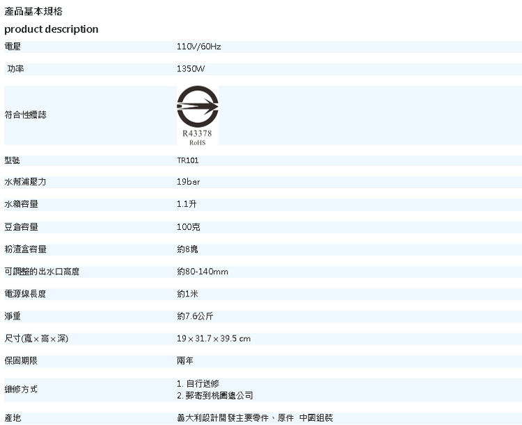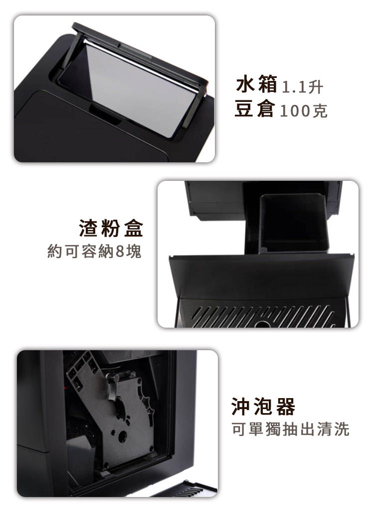 Tiamo TR101 義式全自動咖啡機 110V(HG6464WH) 品號:11911022 小巧機身性能高 觸控沖煮水溫 白色款 黑色款