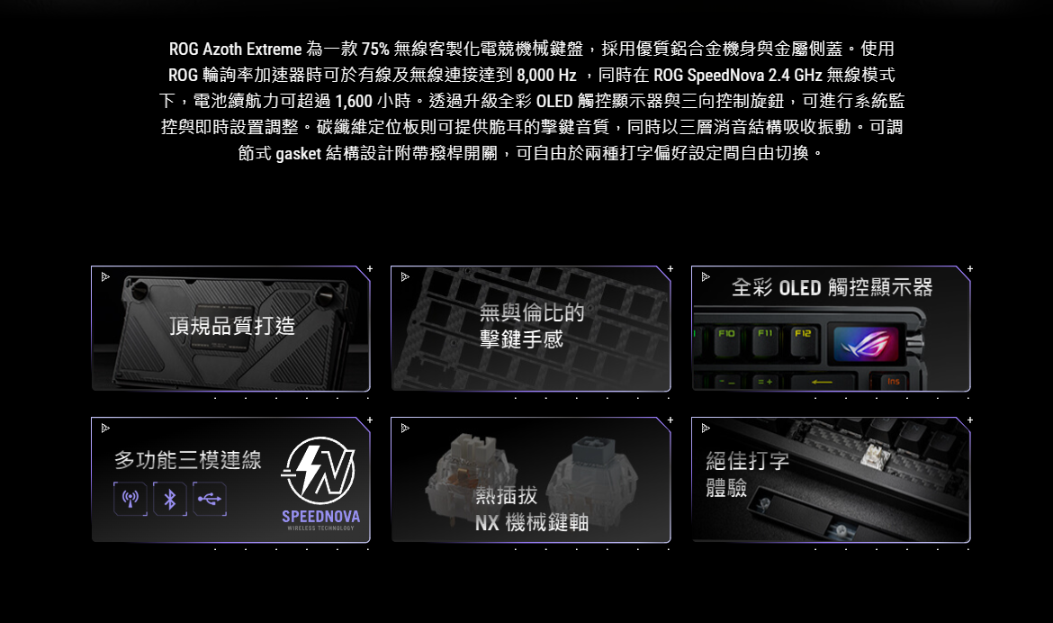 ROG Azoth Extreme 為一款 75% 無線客製化電競機械鍵盤,採用優質鋁合金機身與金屬側蓋。使用 ROG 輪詢率加速器時可於有線及無線連接達到 8,000 Hz ,同時在 ROG SpeedNova 2.4 GHz 無線模式下,電池續航力可超過 1,600 小時。透過升級全彩 OLED 觸控顯示器與三向控制旋鈕,可進行系統監控與即時設置調整。碳纖維定位板則可提供脆耳的擊鍵音質,同時以三層消音結構吸收振動。可調節式 gasket 結構設計附帶撥桿開關,可自由於兩種打字偏好設定間自由切換。
