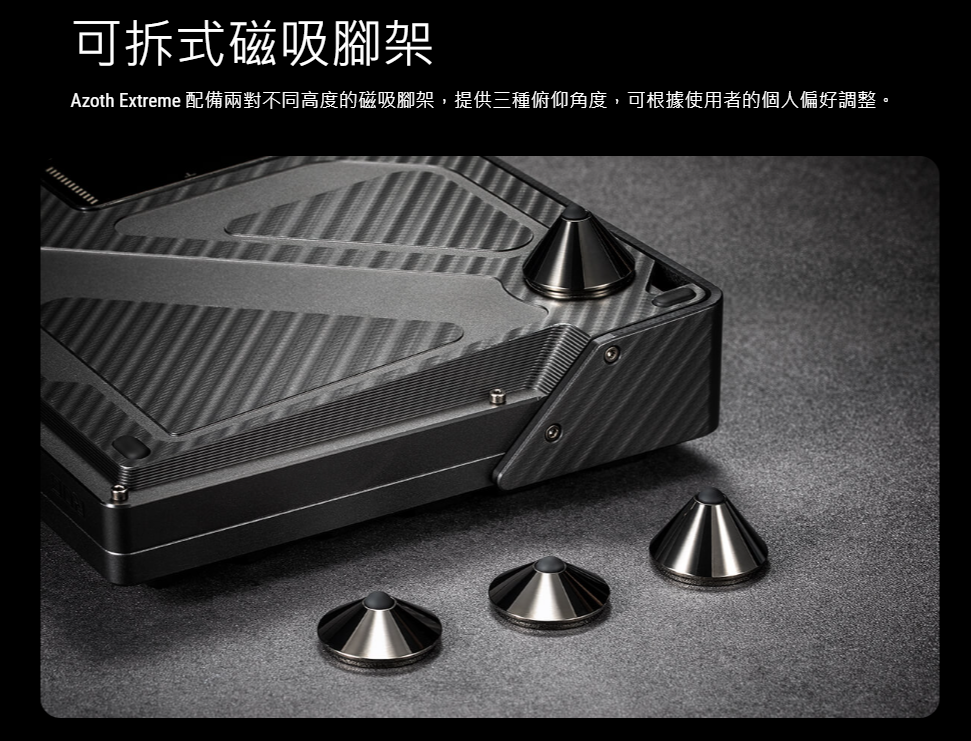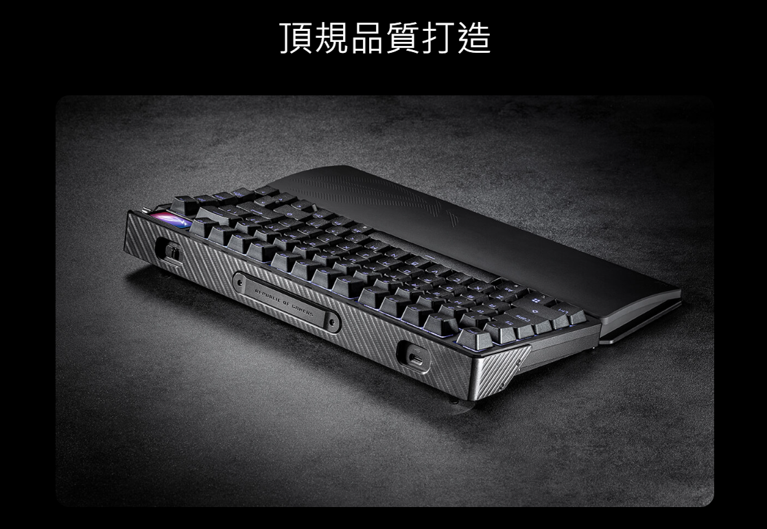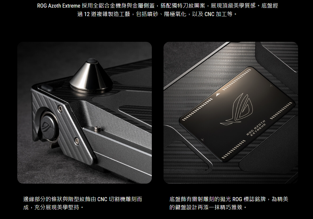 ROG Azoth Extreme 採用全鋁合金機身與金屬側蓋,搭配獨特刀紋圖案,展現頂級美學質感。底盤經過 12 道複雜製造工藝,包括噴砂、陽極氧化,以及 CNC 加工等。