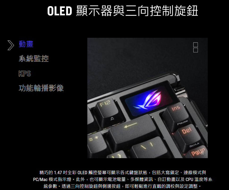 精巧的 1.47 吋全彩 OLED 觸控螢幕可顯示各式鍵盤狀態,包括大寫鎖定、連線模式與 PC/Mac 模式指示燈。此外,也可顯示電池電量、多媒體資訊、自訂動畫以及 CPU 溫度等系統參數。透過三向控制旋鈕與側邊按鈕,即可輕鬆進行直觀的調校與設定調整。