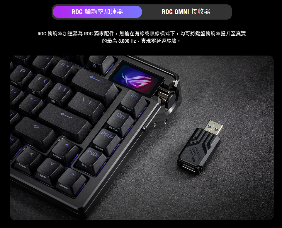 ROG SpeedNova 無線技術在 2.4 GHz RF 模式 (RGB 與 OLED 關閉) 下,可提供長達 1,600 小時以上穩定、不間斷的零延遲遊戲體驗。您也可以透過藍牙模式,同時連接最多三台裝置,或者使用有線 USB 模式,在遊戲的同時進行充電。