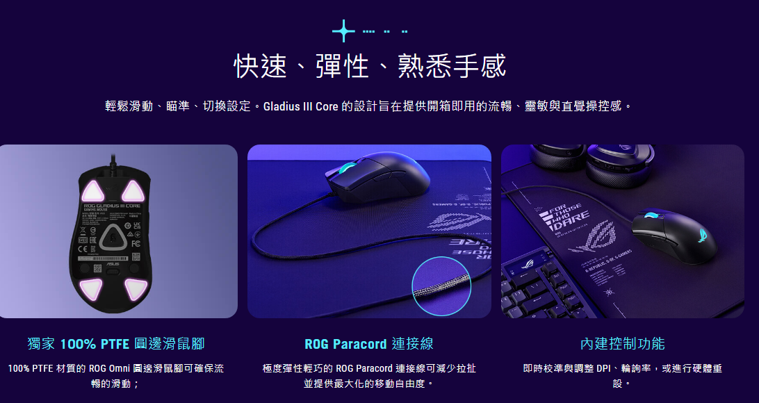 ROG Gladius III Core 是一款 71 公克的有線電競滑鼠,採用人體工學設計,搭載 12,000 dpi 光學感應器、ROG 二代微動開關、ROG 可更換微動開關插槽、ROG Paracord 連接線以及 100% PTFE 圓邊滑鼠腳。​