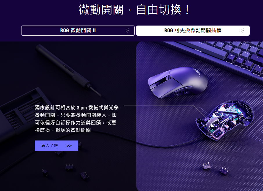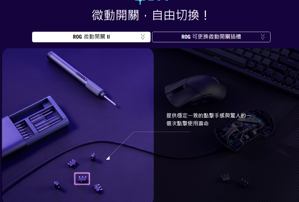 • ROG 二代微動開關:  提供俐落的點擊手感與卓越的一億次點擊使用壽命