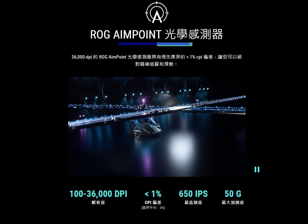 • ROG AimPoint 光學感測器:新一代 36,000-dpi 光學感測器具有領先業界的 < 1% cpi 偏差,提供極致精確程度