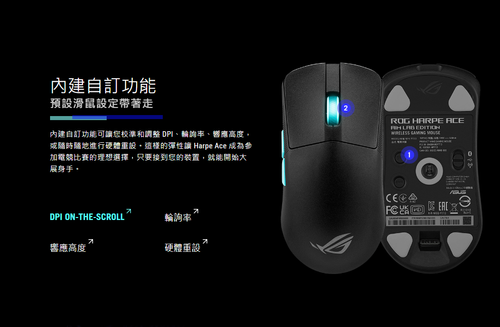 超輕量的 ROG Harpe Ace Aim Lab Edition 是一款 54g 的無線電競滑鼠,經專業玩家測試認可的外型、36,000-dpi ROG AimPoint 光學感測器、ROG SpeedNova 無線技術、三模連線功能、ROG 微動開關、五個可編程按鈕,以及 Aim Lab Settings Optimizer 智能最佳化滑鼠設定。