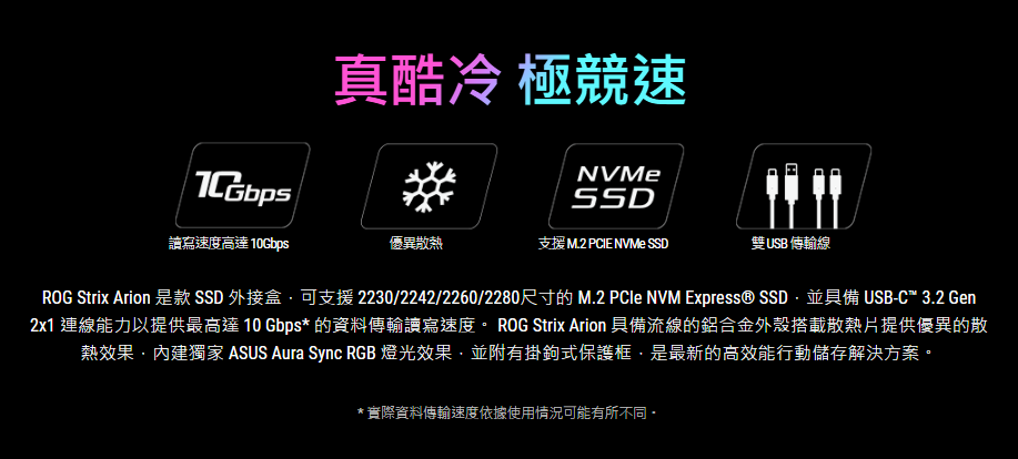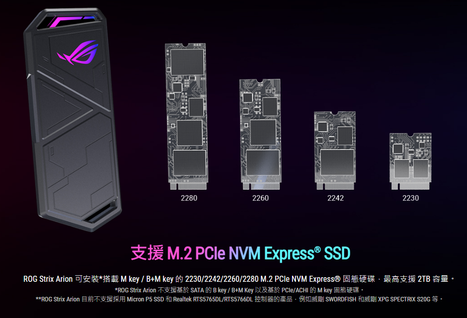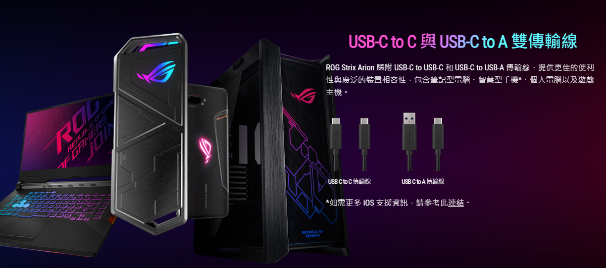 ROG Strix Arion M.2 NVMe SSD 外接盒— USB3.2 Gen 2x1 Type-C (10 Gbps)、雙 USB-C to C 與 USB-C to A 傳輸線、獨家 Sim 卡針開蓋免工具安裝、搭載散熱片、支援 PCIe 2280/2260/2242/2230 M key/B+M Key