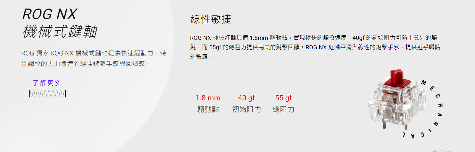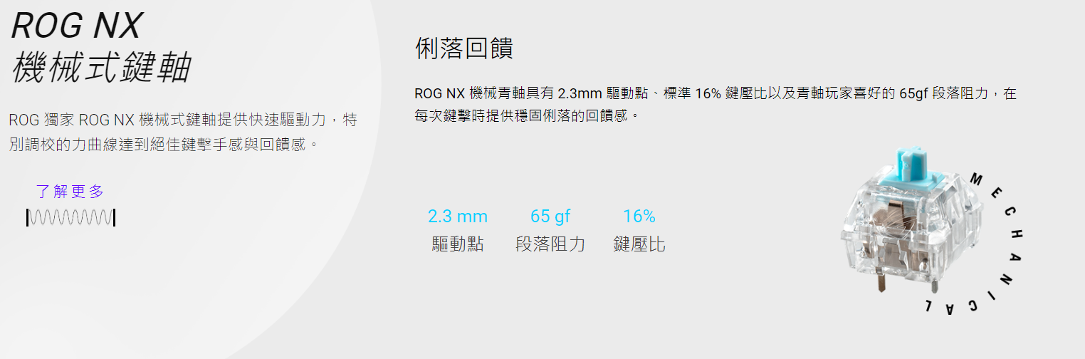 • ROG 自有軸體:ROG NX 機械軸具備 7000 萬次點擊壽命、高速觸發力以及特殊調校的觸發行程,提供絕佳的觸鍵手感與回饋