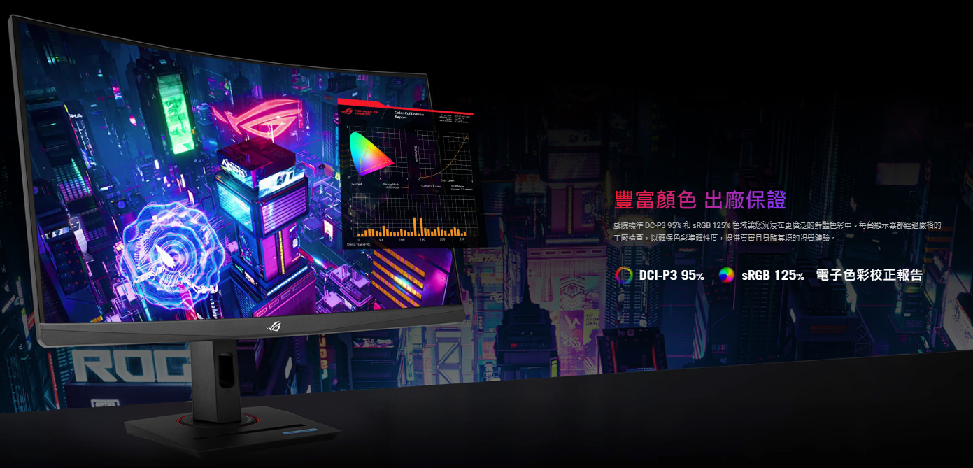 • 95% 的 DCI-P3 色域,搭配 ASUS 先進的灰階追蹤技術,確保了更平滑的色彩變化和均勻度。
