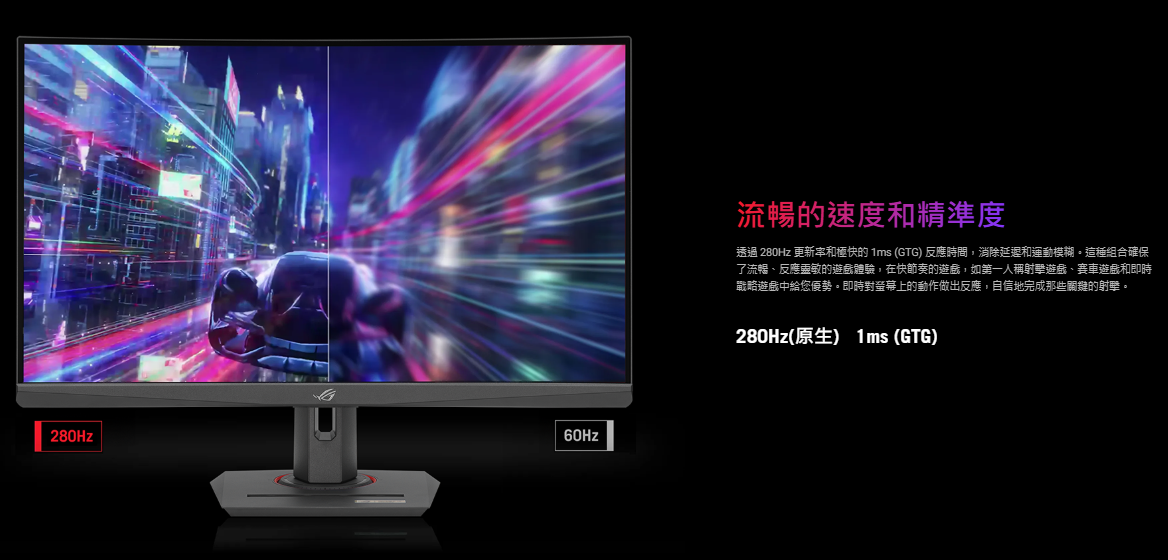 • 32 吋 曲面 2560 x 1440 HDR 電競顯示器,搭載極快 280Hz (超頻) 更新率,專為職業玩家和沈浸式遊戲所設計。