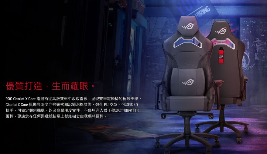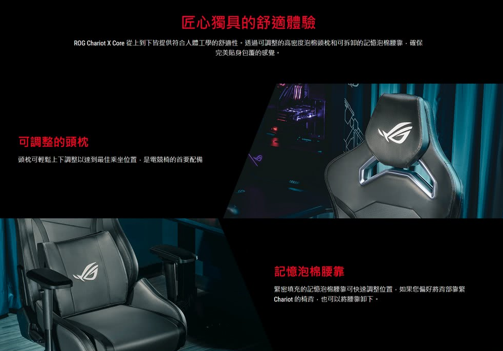 ROG Chariot X Core電競椅以賽車風格打造,使用強化 PU 皮革提升舒適及耐用性。 配備可調節的頭枕、腰靠枕、4D 扶手、耐用的四級氣壓桿以及可自由調整後仰的底盤,為您帶來頂級的遊戲體驗。無光款