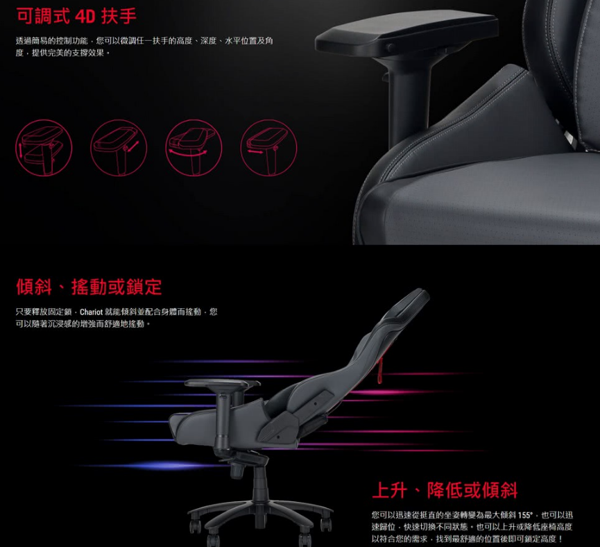 • 可調式 4D 扶手及最大傾斜 155° 的椅背,加上可鎖定傾斜機構,讓玩家完全沉浸於遊戲中