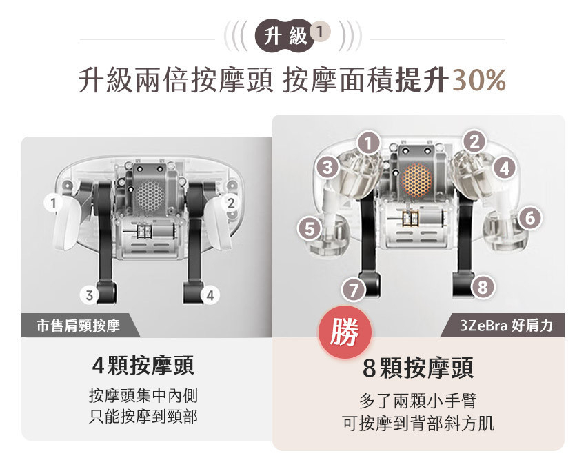 ❶ 8 顆按摩頭,可按摩到斜方肌群