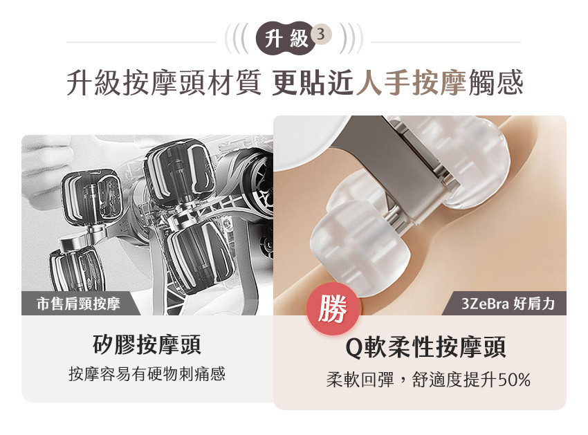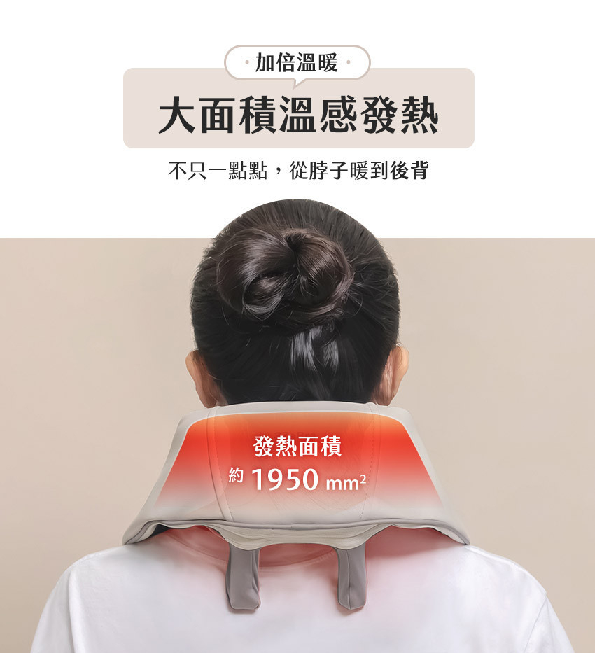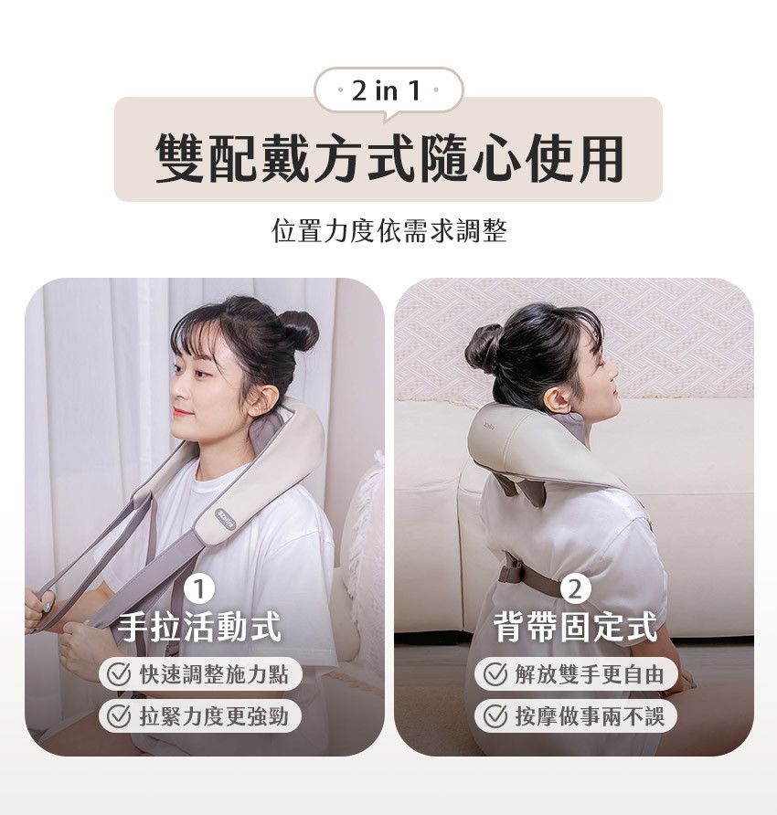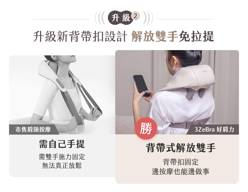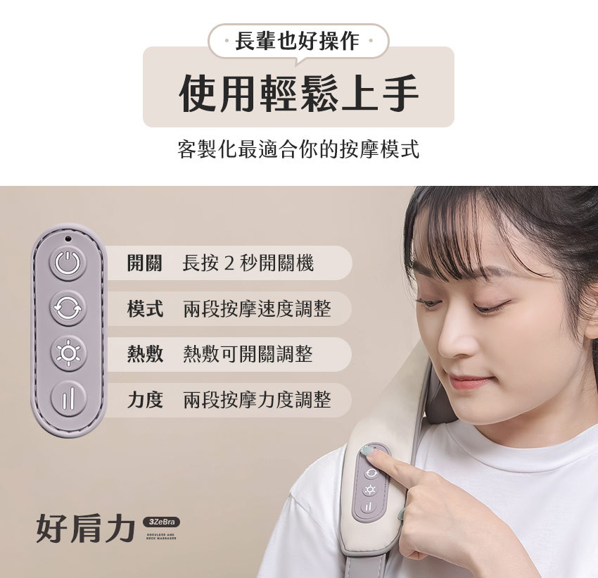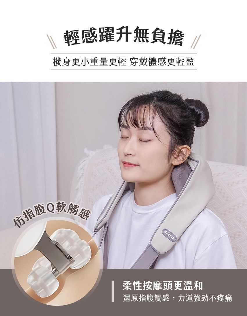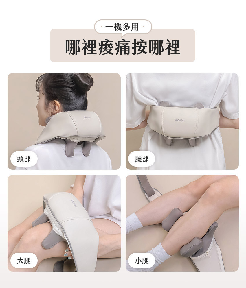 【3ZeBra】好肩力|斜方肌肩頸按摩器 產品特色 ❶ 8 顆按摩頭,可按摩到斜方肌群 ❷ 擬真人夾揉,直擊肩頸痠痛點 ❸ NTC 智能控溫,大面積加倍溫熱 ❹ 兩種穿戴法,背帶設計解放雙手 ❺ 布套可拆洗,家人共用更衛生 ❻ 可多部位按摩,哪裡痠痛按哪裡