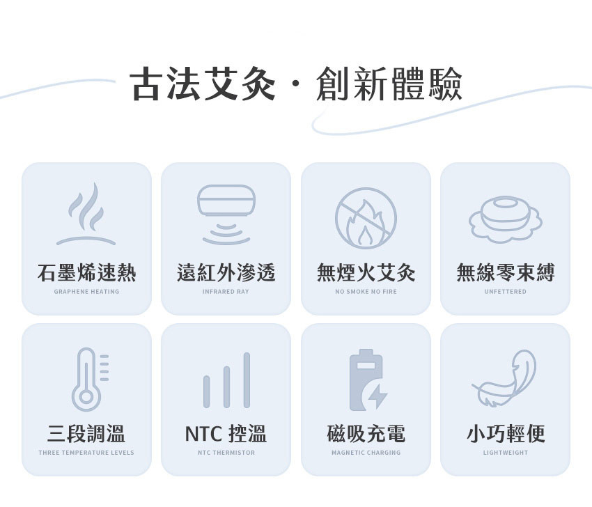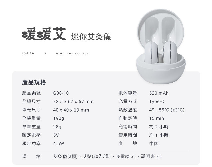【3ZeBra】暖暖艾|迷你艾灸儀(附30入艾貼) 產品特色 ~石墨烯速熱,NTC 晶片控溫穩定滲透 ~ 無煙無明火,艾貼熱敷更安全簡便 ~ 32mm 大面積熱灸頭,多部位可使用 ~ 15 分鐘自動定時,操作簡易好上手 ~ 磁吸充電盒,拿起即用放下即充 ~ 隨身艾護好攜帶,隨附 30 片艾貼 ※ 建議溫度從最低段開始,根據個人情況逐漸調節至適合自己的溫度,避免對熱不敏感導致皮膚燙傷。