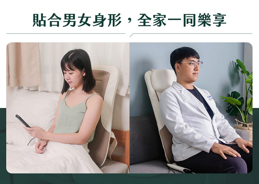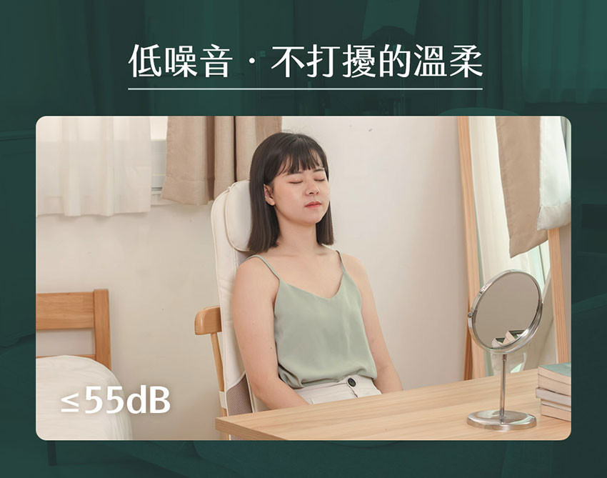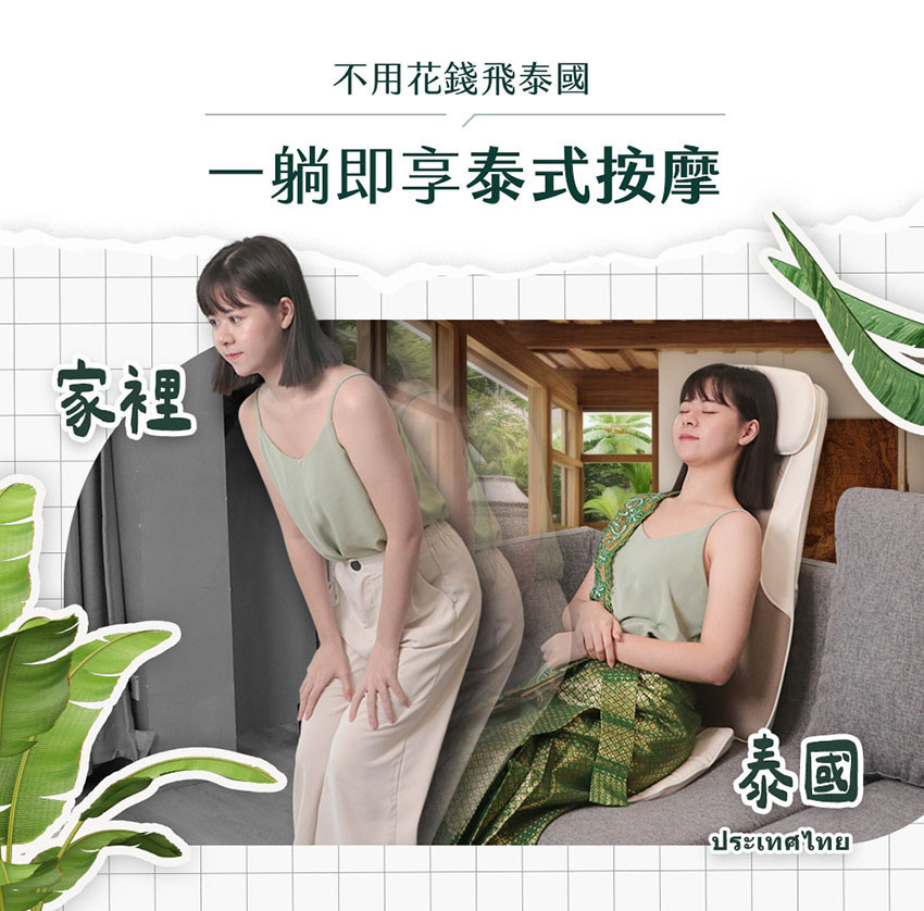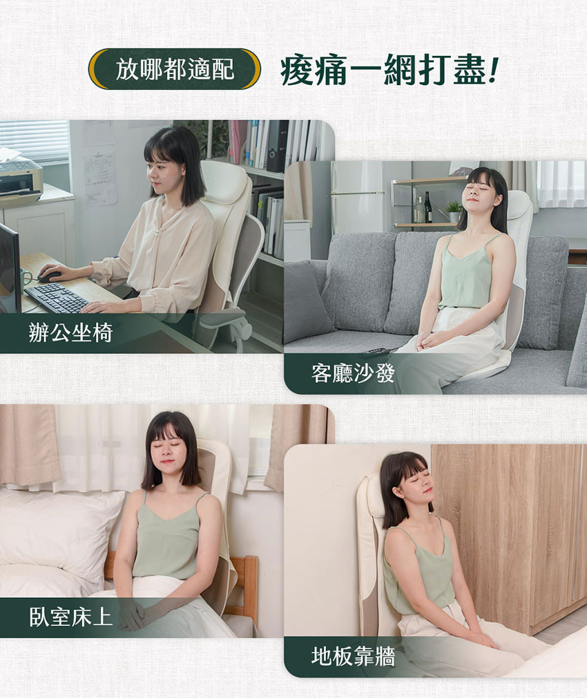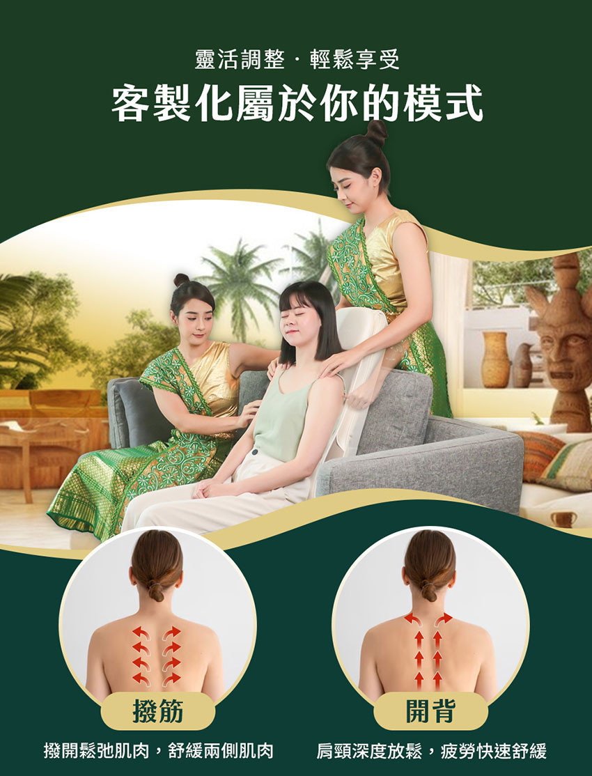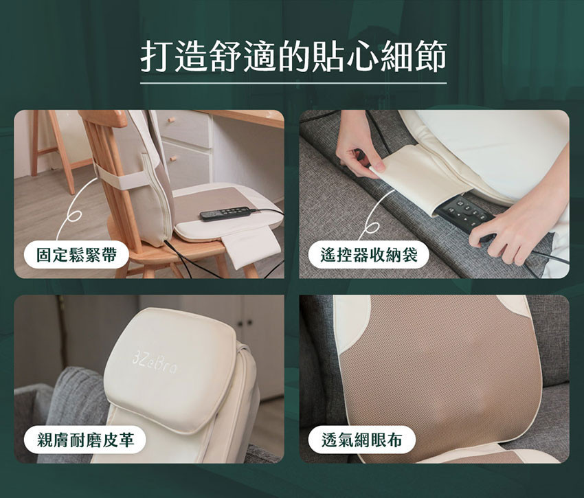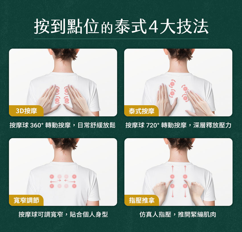 產品特色 ❶ 按摩滾珠 720° 旋轉,更深層有感的按摩體驗 ❷ 泰式開背按摩手法,多種模式任你選擇 ❸ 超長距離按摩機芯,從肩背到腰臀一機搞定 ❹ 坐墊高脈衝震動,高速震動緩解久坐不適 ❺ 漸進式溫敷,還原人手溫度按摩體驗 ❻ 10 / 20 / 30 分鐘定時,不怕太舒服按過頭 ❼ 可拆卸頭枕,靈活調整客製化最舒服的姿勢 ❽ 按摩緩衝墊設計,可調整力道輕重體驗 ❾ 4kg 市面上最輕巧,摺疊收納不佔位