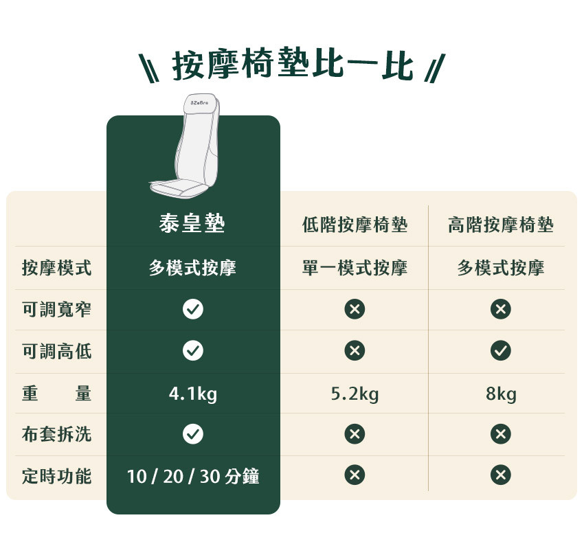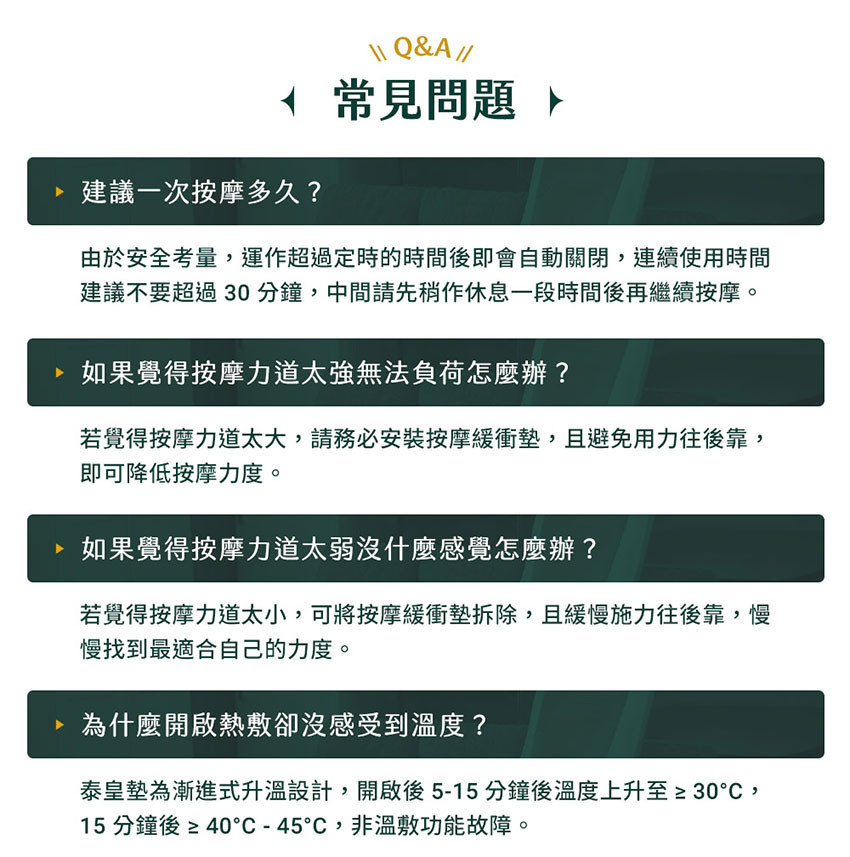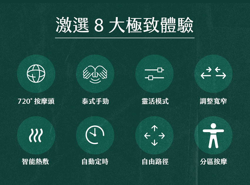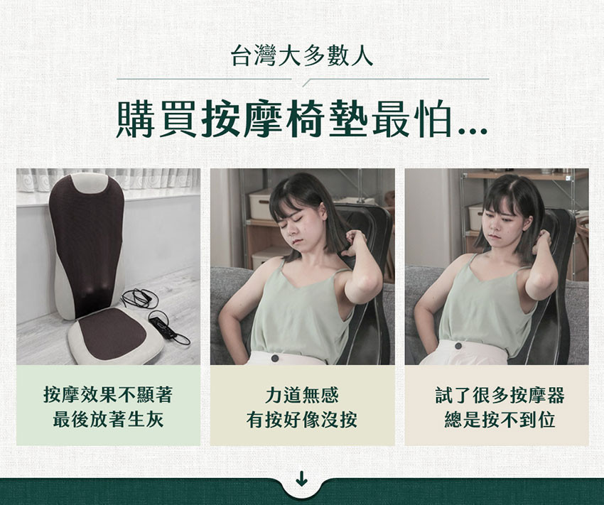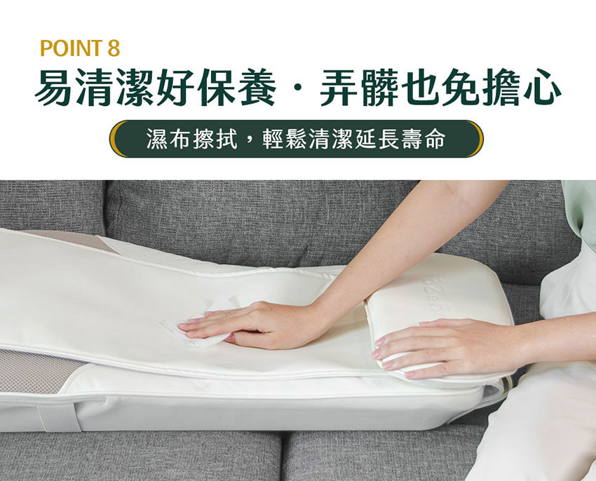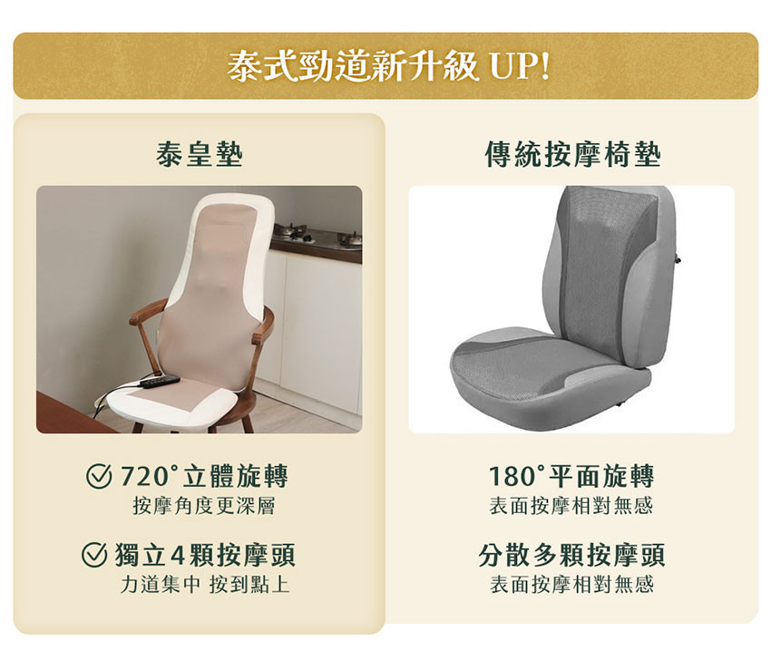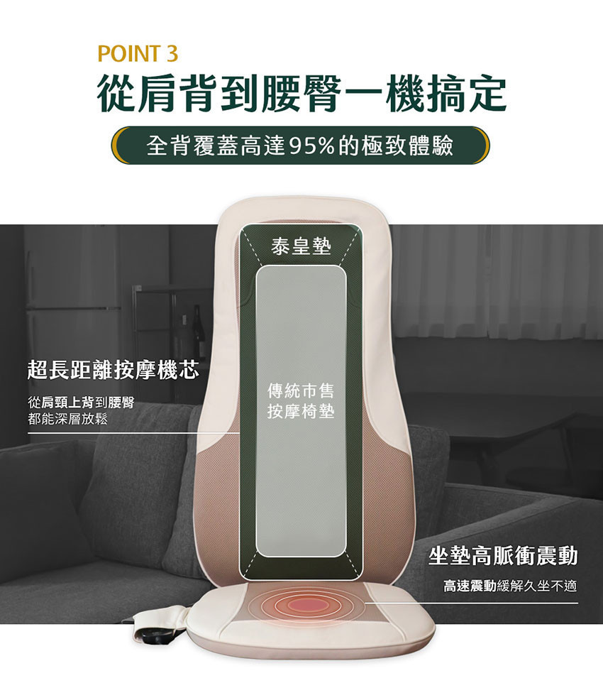 產品特色 ❶ 按摩滾珠 720° 旋轉,更深層有感的按摩體驗 ❷ 泰式開背按摩手法,多種模式任你選擇 ❸ 超長距離按摩機芯,從肩背到腰臀一機搞定 ❹ 坐墊高脈衝震動,高速震動緩解久坐不適 ❺ 漸進式溫敷,還原人手溫度按摩體驗 ❻ 10 / 20 / 30 分鐘定時,不怕太舒服按過頭 ❼ 可拆卸頭枕,靈活調整客製化最舒服的姿勢 ❽ 按摩緩衝墊設計,可調整力道輕重體驗 ❾ 4kg 市面上最輕巧,摺疊收納不佔位
