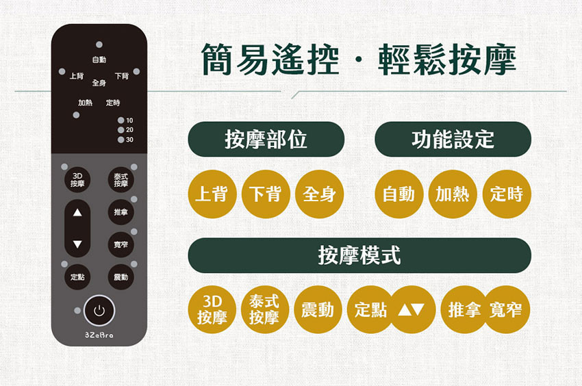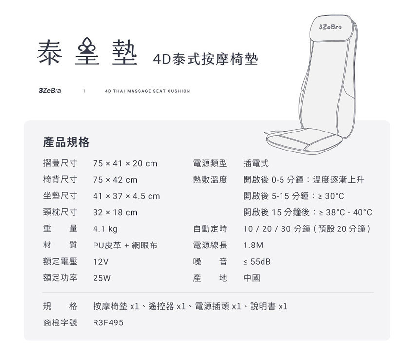 規 格 按摩椅墊 x1、遙控器 x1、電源插頭 x1