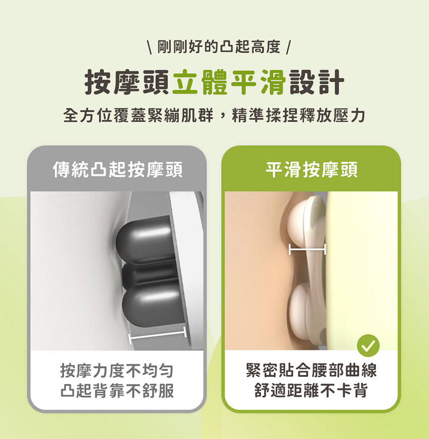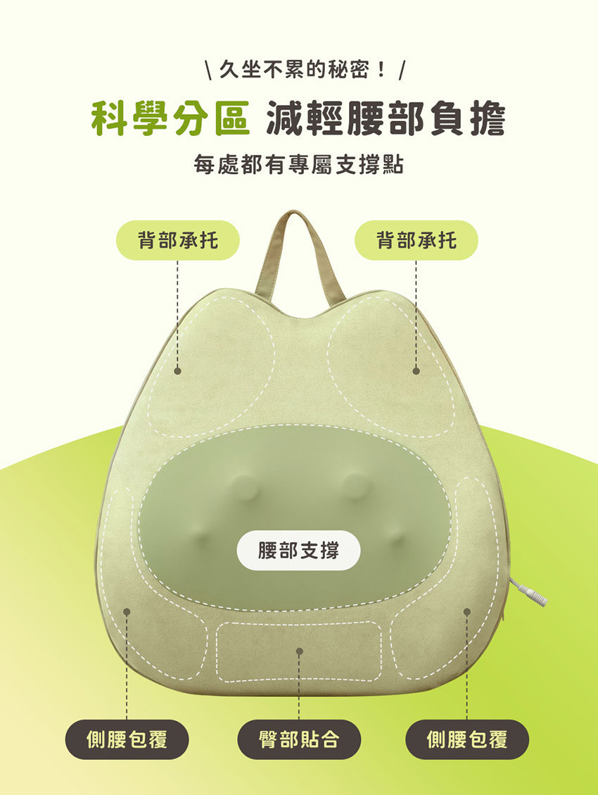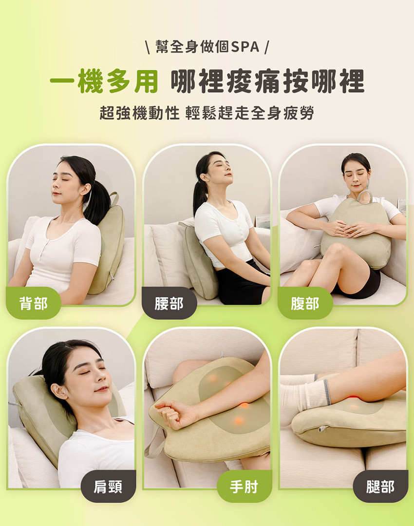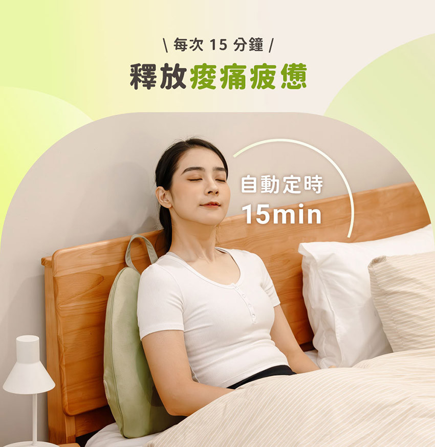 產品特色 ❶ 三合一全方位按摩枕:按摩.靠墊.熱敷 ❷ 平滑按摩頭設計,緊密貼合腰部曲線更舒適 ❸ 擬人手雙向旋轉按摩頭,每分鐘自動切換 ❹ 大面積弧度分區支撐,久坐背靠超舒適 ❺ 42°C 恆溫熱敷,促進循環放鬆肌肉 ❻ 慢回彈記憶棉,柔軟耐用不塌陷 ❼ 可多部位按摩,滿足你多種日常需求 ❽ 15 分鐘自動定時,無線充電使用不受限 ❾ 可拆洗布套設計,易清潔好保養更耐用
