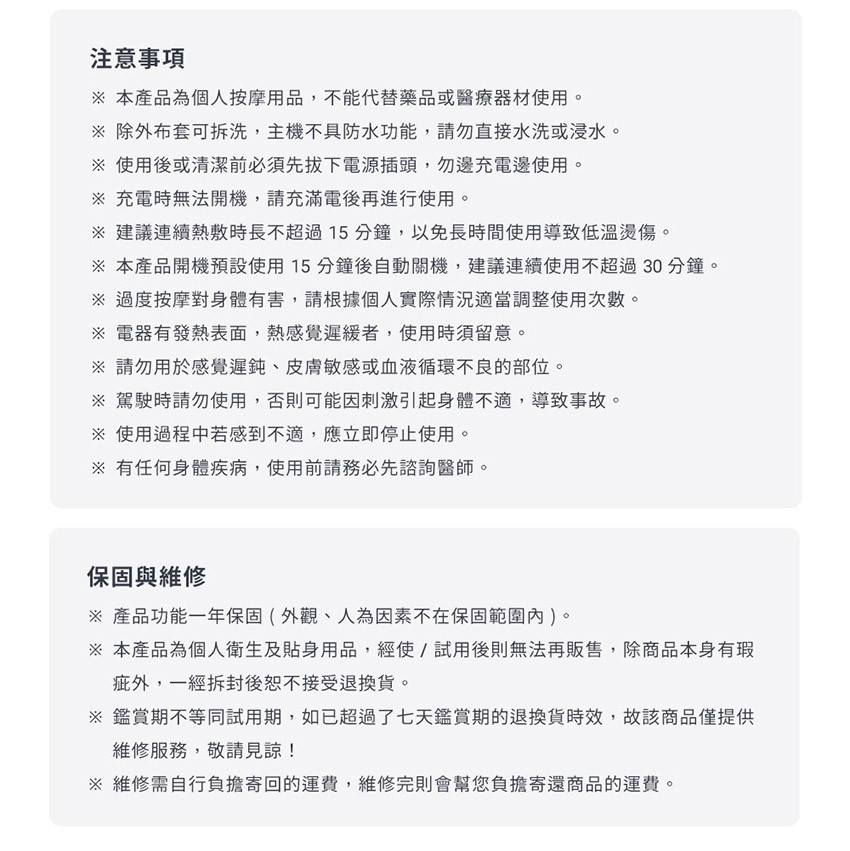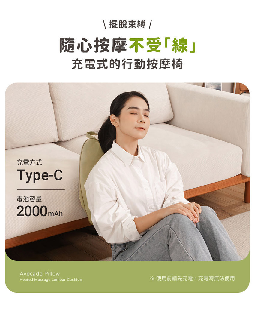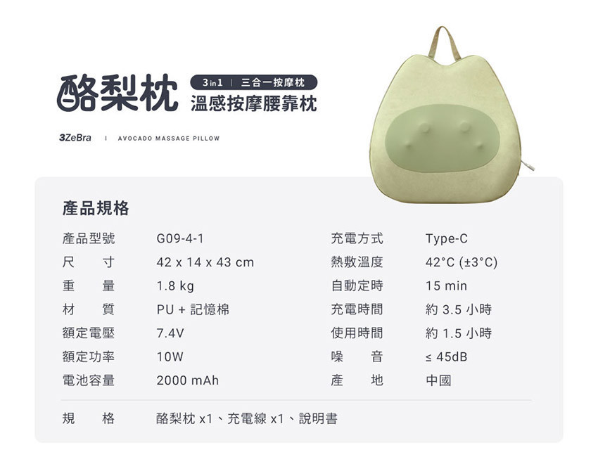 規  格  酪梨枕 x1、充電線 x1、說明書
