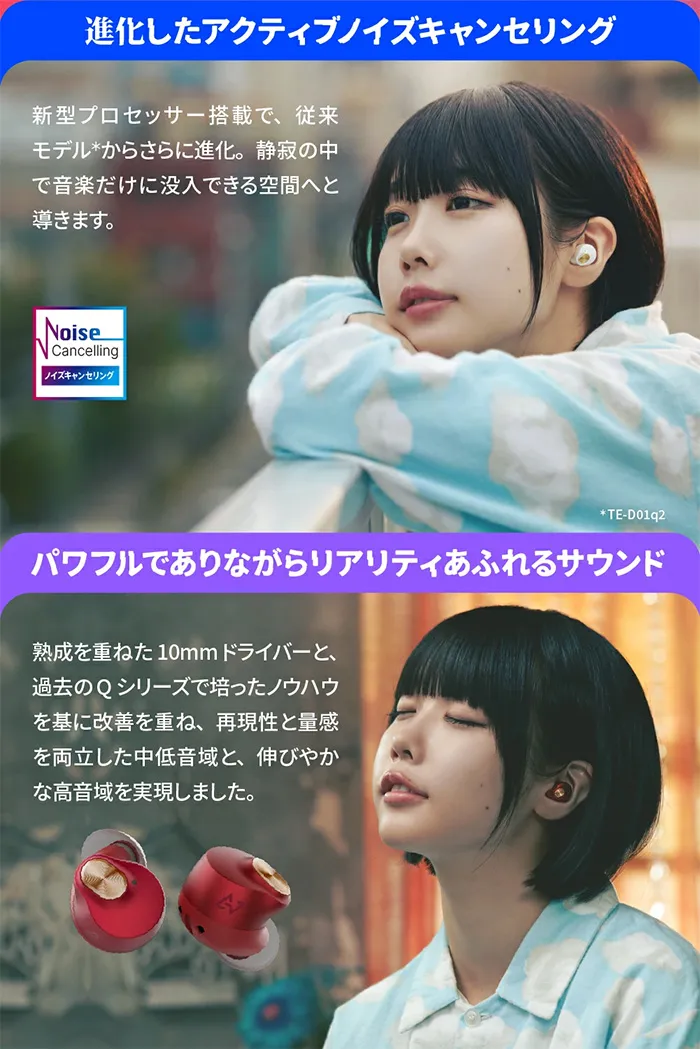 AVIOT 真無線藍牙耳機 TE-Q3 ~主動降噪|配備新的處理器,比之前的型號更加進步,將帶您進入安靜的空間。 ~體積小 續航力高|耳機單次最長播放時間11.5小時,含充電盒42小時 ~MEMS麥克風|配備用於通話的高品質麥克風和採用AI技術的演算法,可區分並消除周圍噪音 ~主動降噪 ~ 耳機偵測功能 ~ 輕量化設計 ~ 環境音模式 ~ 多點連接 ~ IPX4防水 ~ 單耳模式 ~ 專屬APP ~ 高級MEMS麥克風 ~ 高靈敏度觸控感應器 ~最長通話時間5.5小時 ~耳機單次最長播放時間11.5小時;含充電盒42小時 ~界最小的ANC降噪耳機