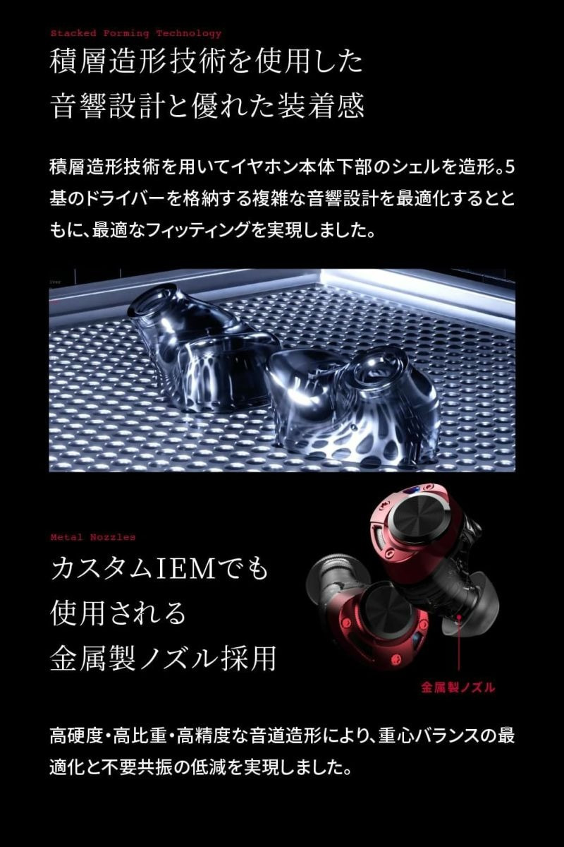 ~複雜聲學設計:由積層製造技術打造耳機的金屬本體,搭載5個驅動器,實現優越的聲學工藝與舒適配戴感。