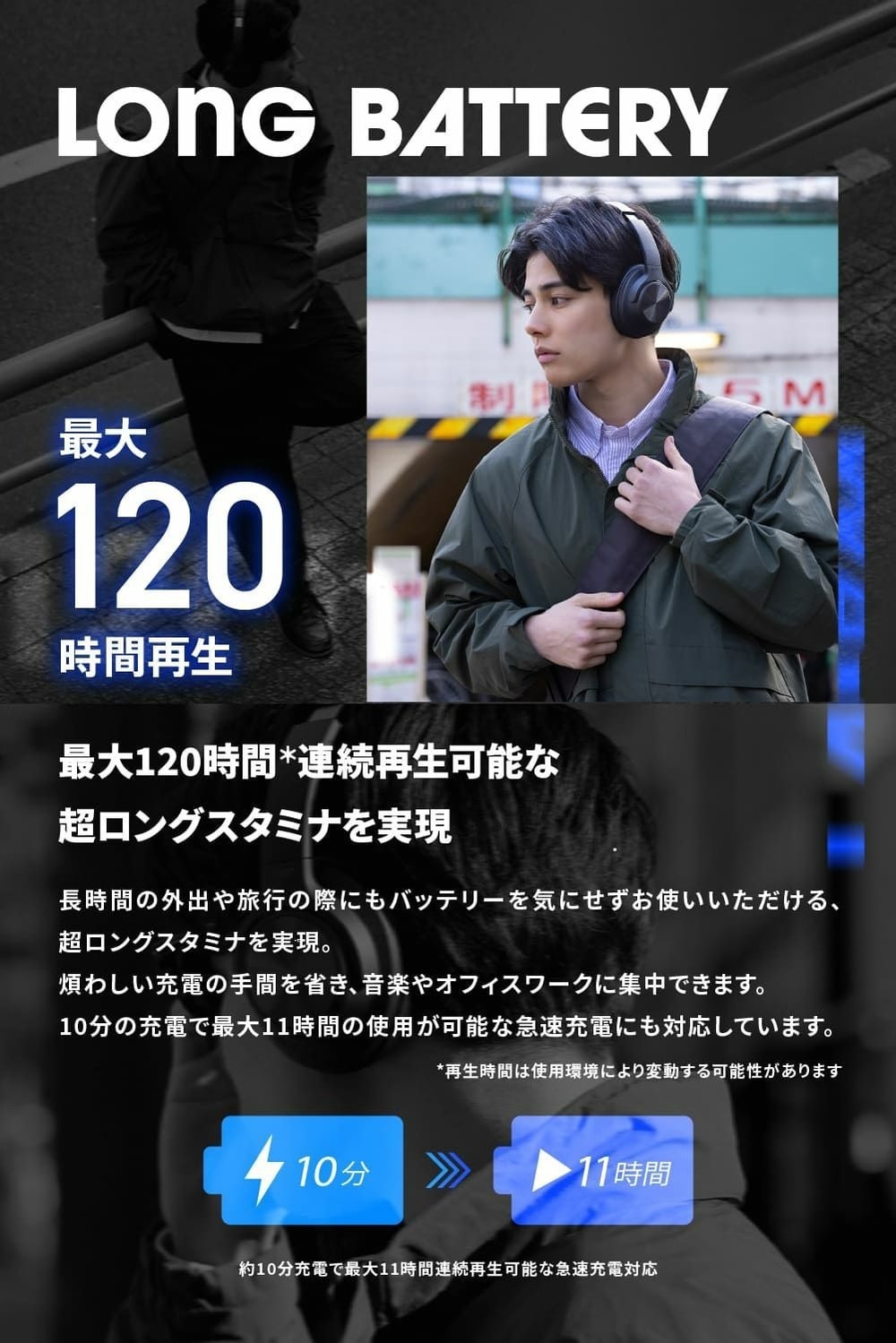 享受長達 120 小時的連續播放,非常適合長途旅行和長時間聆聽。 充電只需 10 分鐘後,快速充電即可使用 11 小時。