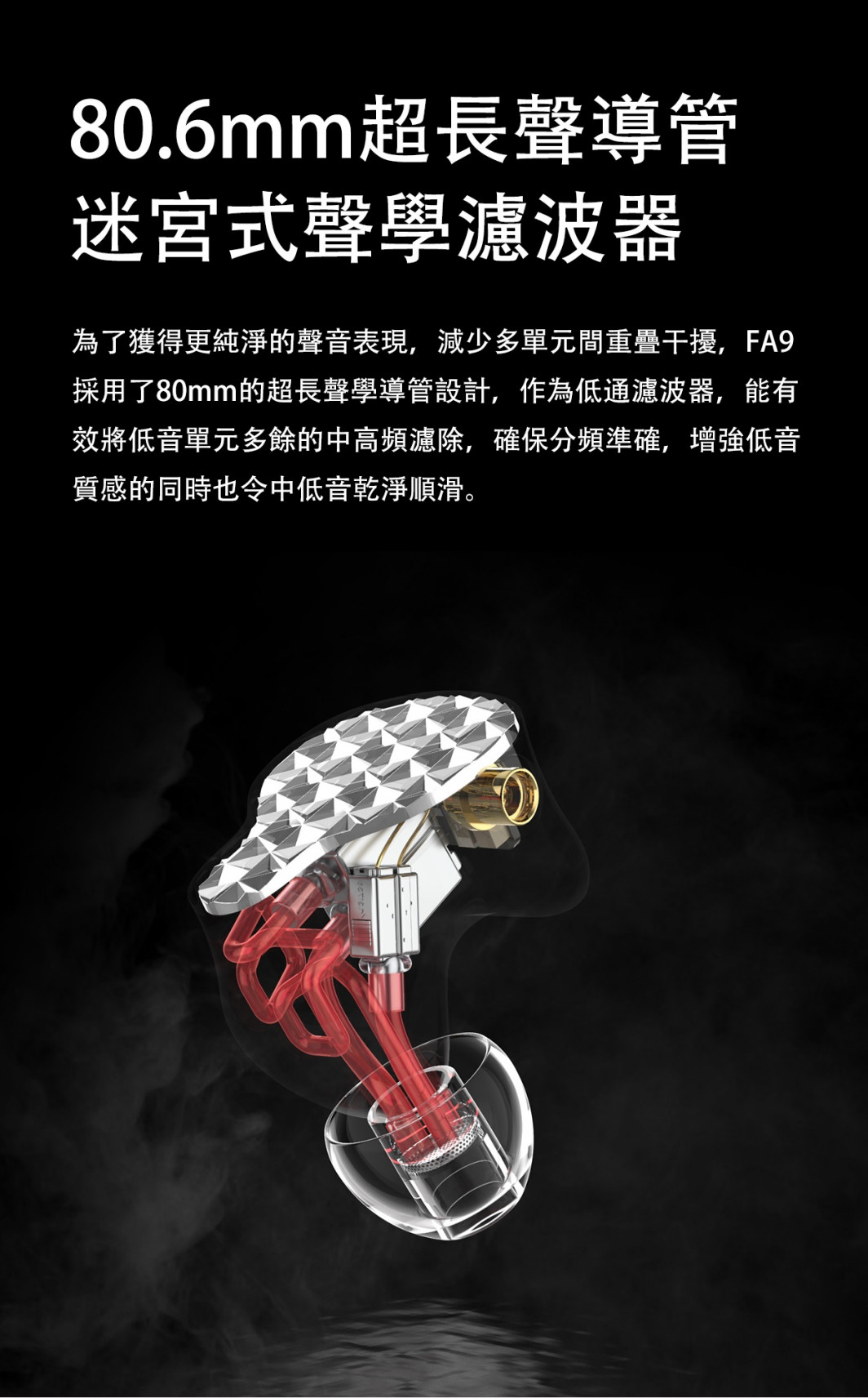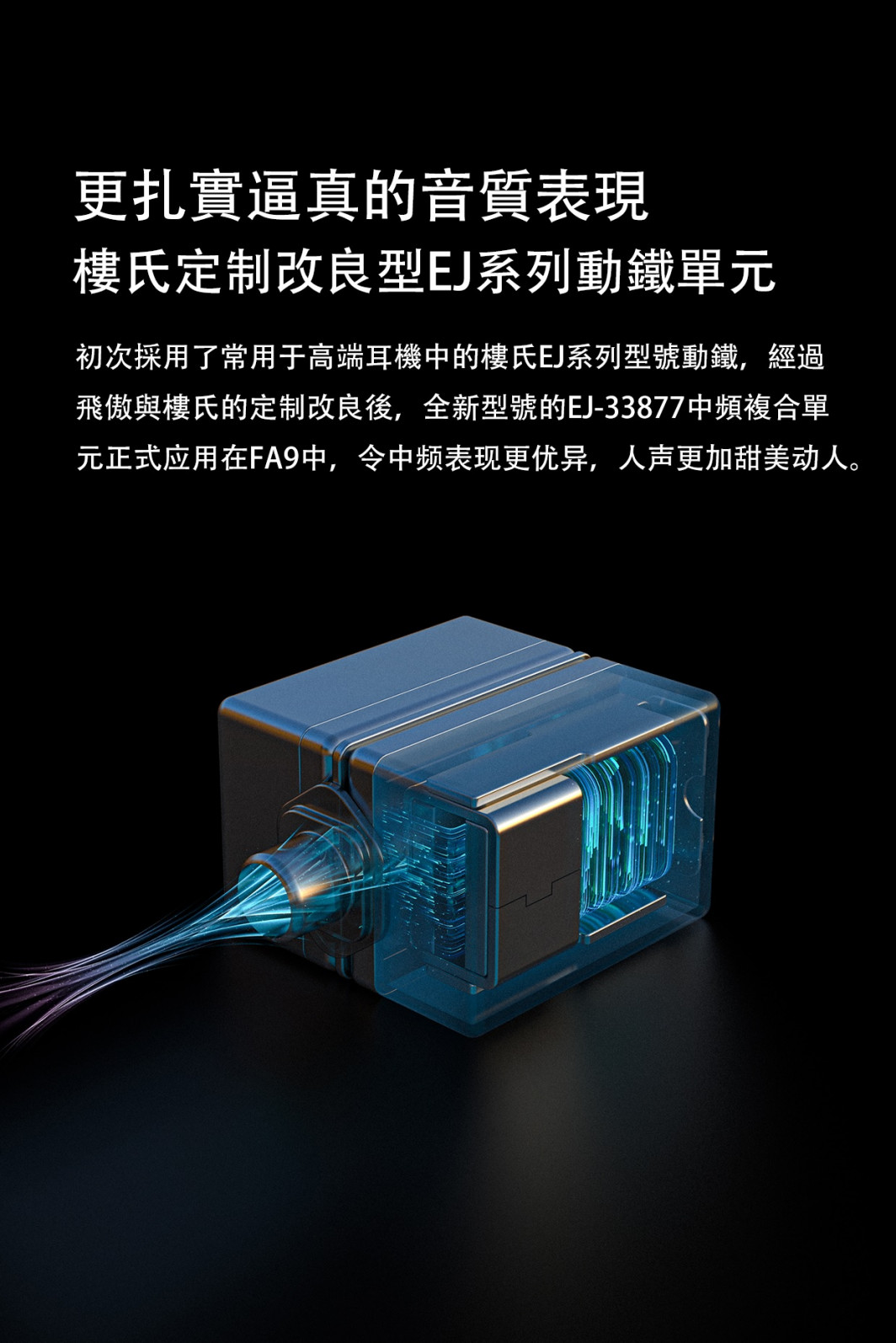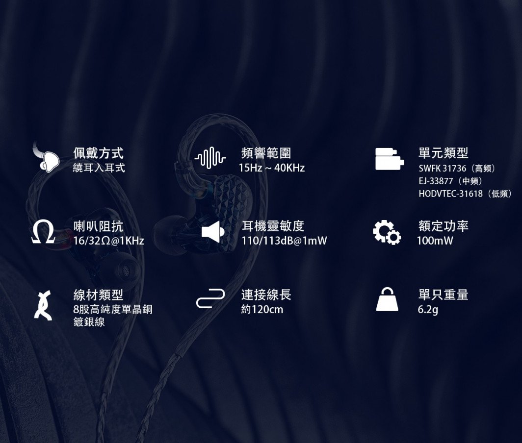 匠心打造 悠揚悅耳 【FiiO FA9 樓氏六單元動鐵MMCX單晶銅鍍銀可換線耳機】 FA9純動鐵結構耳機- 旗艦 FA9 採用六個美國樓氏動鐵單元及三導管四音分頻組合,聲音整體流暢銜接,給你震撼的聽覺效果。 動鐵分別為一個複合HODVTEC-31618低頻單元、一個EJ-33877中頻單元 和SWFK-31736複合高音單元組合而成,並可自由調節三段式調音,變換不同曲風。 標準獨立四音分頻精確計算各單元頻率銜接, 低音動力澎湃、中音人聲清晰、高音及超高音解析強而不刺耳。 延續FiiO八股高純度單晶銅鍍銀線材,可有效減少失真及信號傳遞的損失,將原音清晰傳導。 採用全新類鑽石切割面板,嵌入在半透明樹脂腔體之中, 外殼採用3D列印技術,有效降低腔體共振,一體成型構造將聲音表現更自然。 根據數萬名人耳數據模型進行採樣,設計出符合人體工學的耳廓結構,提供如私人訂製般的舒適佩戴體驗。 ● 美國樓氏六動鐵單體結構 ● 三段式開關調音,八種聲音可調配 ● 低.中.高.超高獨立四音分頻 ● 80.6mm超長聲學導管 ● Hi-Res音頻認證 ● 高純度單晶銅鍍銀MMCX可換線 ● 德國進口樹酯DLP 3D列印 ● 如客製化般配戴效果 產品規格 型 號:FA9 驅動單體:複合HODVTEC-31618動鐵×1/EJ-33877動鐵×1/SWFK-31736定制雙複合動鐵×1 阻 抗:16/32Ω@1KHz 頻率範圍:15Hz-40kHz 靈 敏 度:110/113dB@1mW 額定功率:100mW 耳機接頭:MMCX 音源插頭:3.5mm L型插頭 線芯材質:單晶銅鍍銀 線 長:120cm 重 量:單個6.2g 產 地:中國 ※以上規格如有誤,以原廠公佈為準