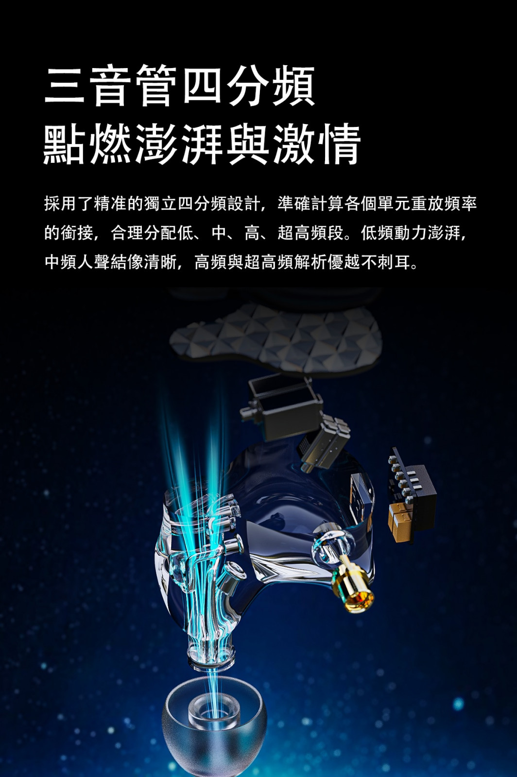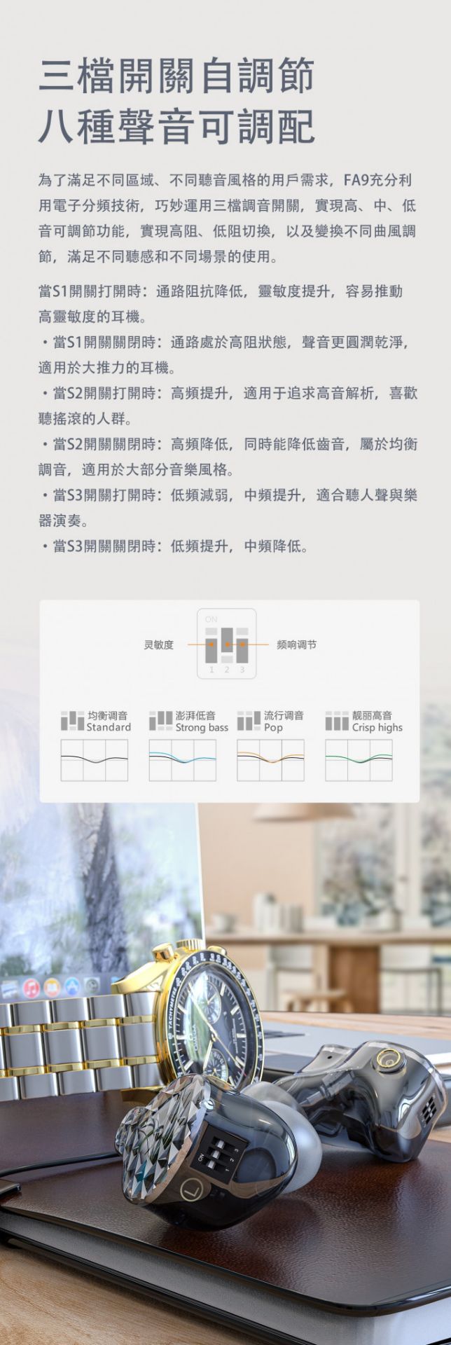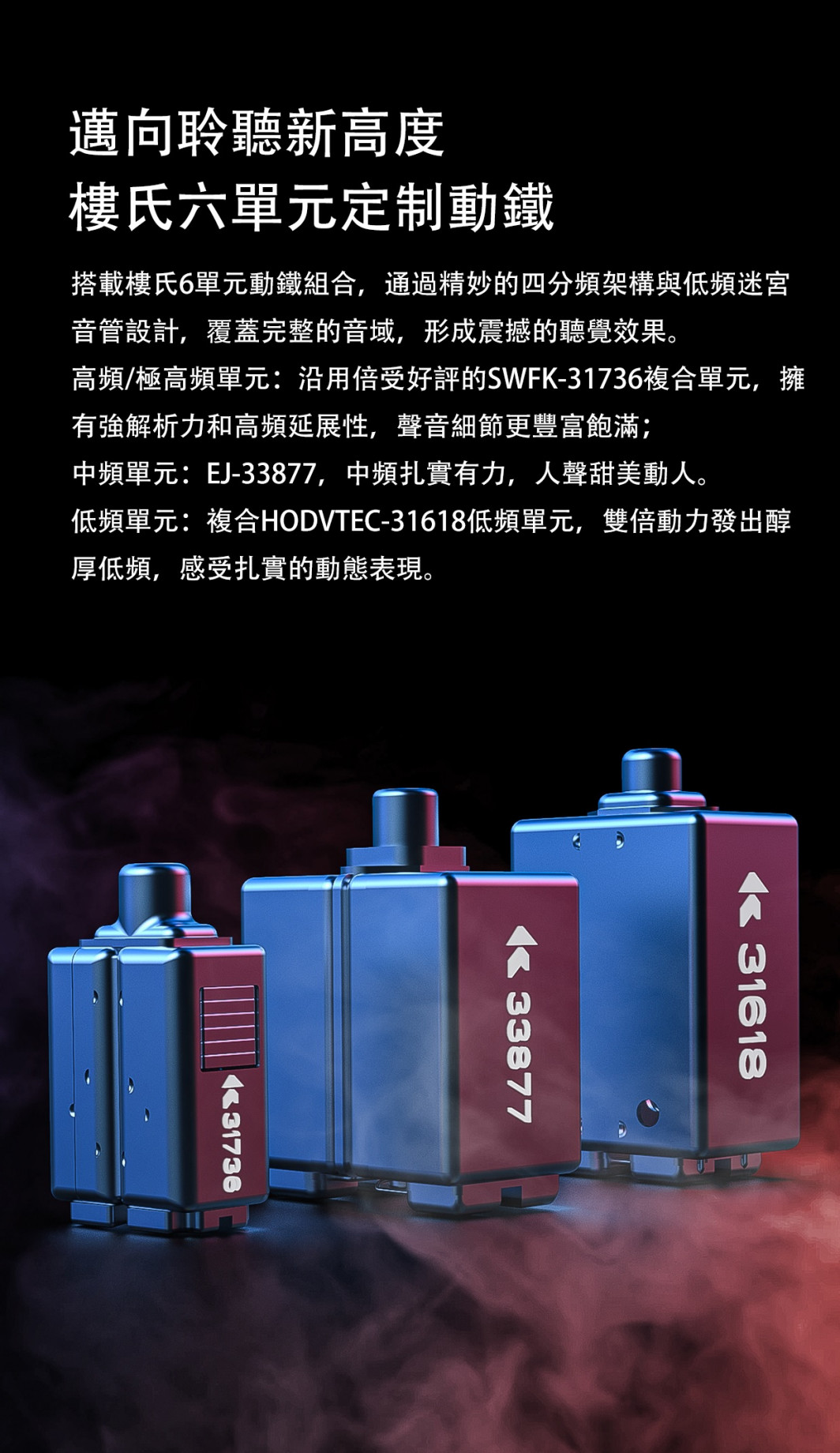 匠心打造 悠揚悅耳 【FiiO FA9 樓氏六單元動鐵MMCX單晶銅鍍銀可換線耳機】 FA9純動鐵結構耳機- 旗艦 FA9 採用六個美國樓氏動鐵單元及三導管四音分頻組合,聲音整體流暢銜接,給你震撼的聽覺效果。 動鐵分別為一個複合HODVTEC-31618低頻單元、一個EJ-33877中頻單元 和SWFK-31736複合高音單元組合而成,並可自由調節三段式調音,變換不同曲風。 標準獨立四音分頻精確計算各單元頻率銜接, 低音動力澎湃、中音人聲清晰、高音及超高音解析強而不刺耳。 延續FiiO八股高純度單晶銅鍍銀線材,可有效減少失真及信號傳遞的損失,將原音清晰傳導。 採用全新類鑽石切割面板,嵌入在半透明樹脂腔體之中, 外殼採用3D列印技術,有效降低腔體共振,一體成型構造將聲音表現更自然。 根據數萬名人耳數據模型進行採樣,設計出符合人體工學的耳廓結構,提供如私人訂製般的舒適佩戴體驗。 ● 美國樓氏六動鐵單體結構 ● 三段式開關調音,八種聲音可調配 ● 低.中.高.超高獨立四音分頻 ● 80.6mm超長聲學導管 ● Hi-Res音頻認證 ● 高純度單晶銅鍍銀MMCX可換線 ● 德國進口樹酯DLP 3D列印 ● 如客製化般配戴效果 產品規格 型 號:FA9 驅動單體:複合HODVTEC-31618動鐵×1/EJ-33877動鐵×1/SWFK-31736定制雙複合動鐵×1 阻 抗:16/32Ω@1KHz 頻率範圍:15Hz-40kHz 靈 敏 度:110/113dB@1mW 額定功率:100mW 耳機接頭:MMCX 音源插頭:3.5mm L型插頭 線芯材質:單晶銅鍍銀 線 長:120cm 重 量:單個6.2g 產 地:中國 ※以上規格如有誤,以原廠公佈為準